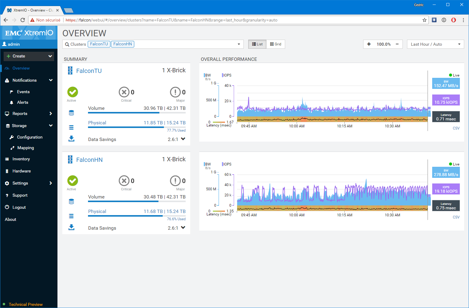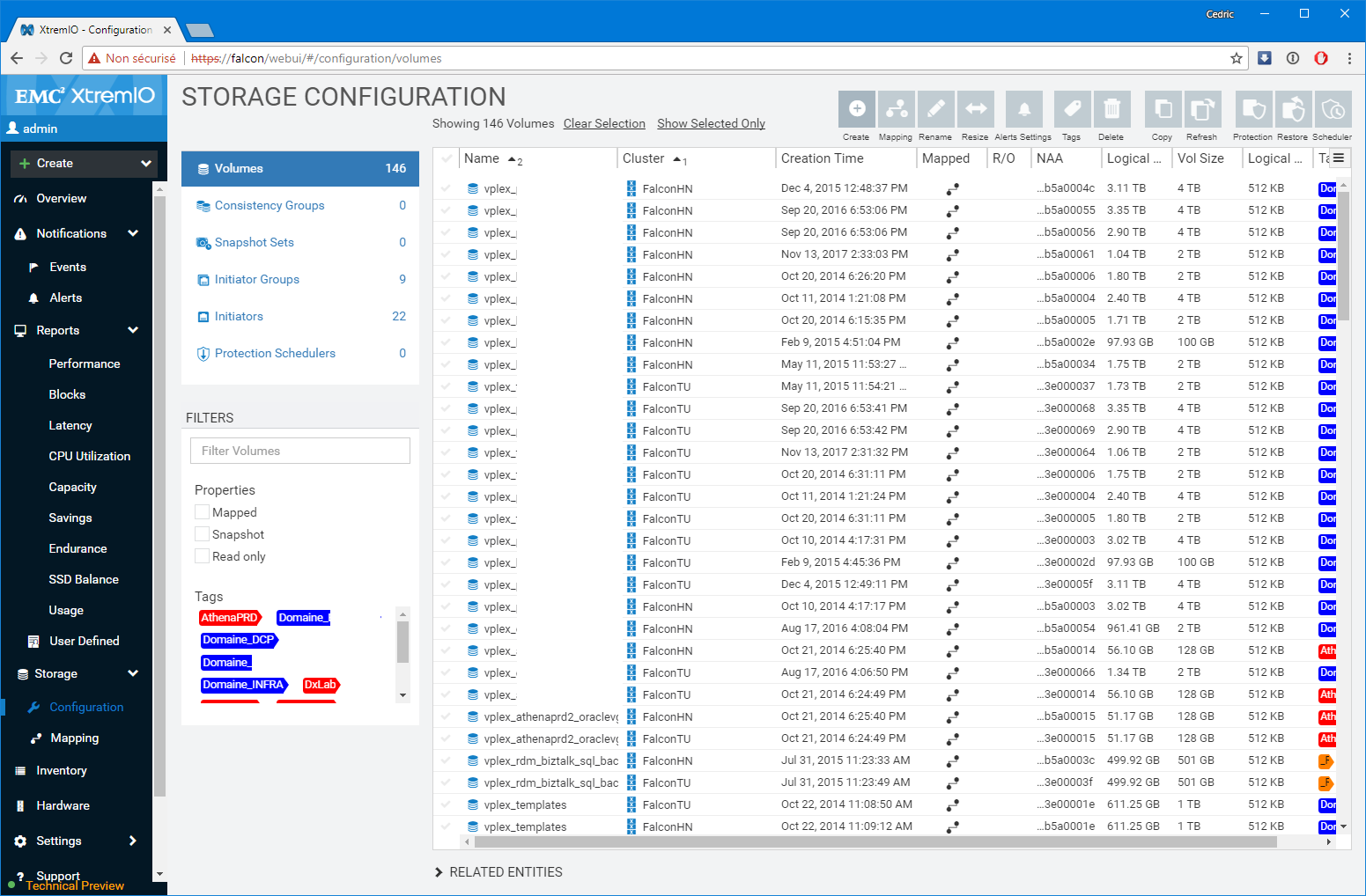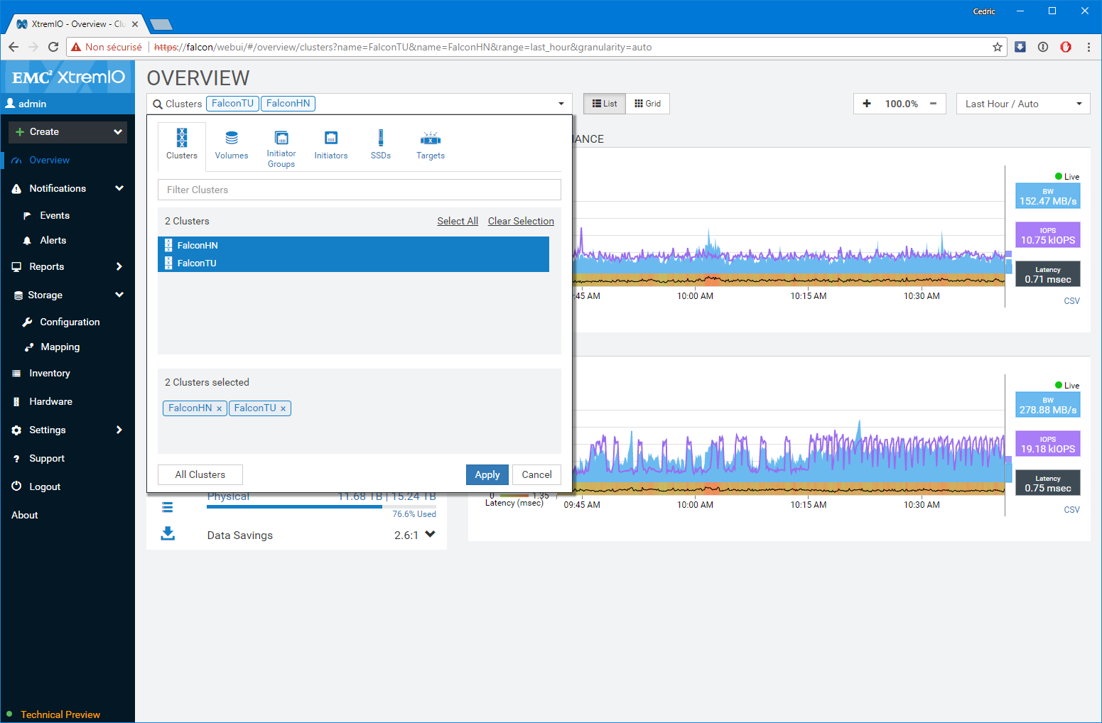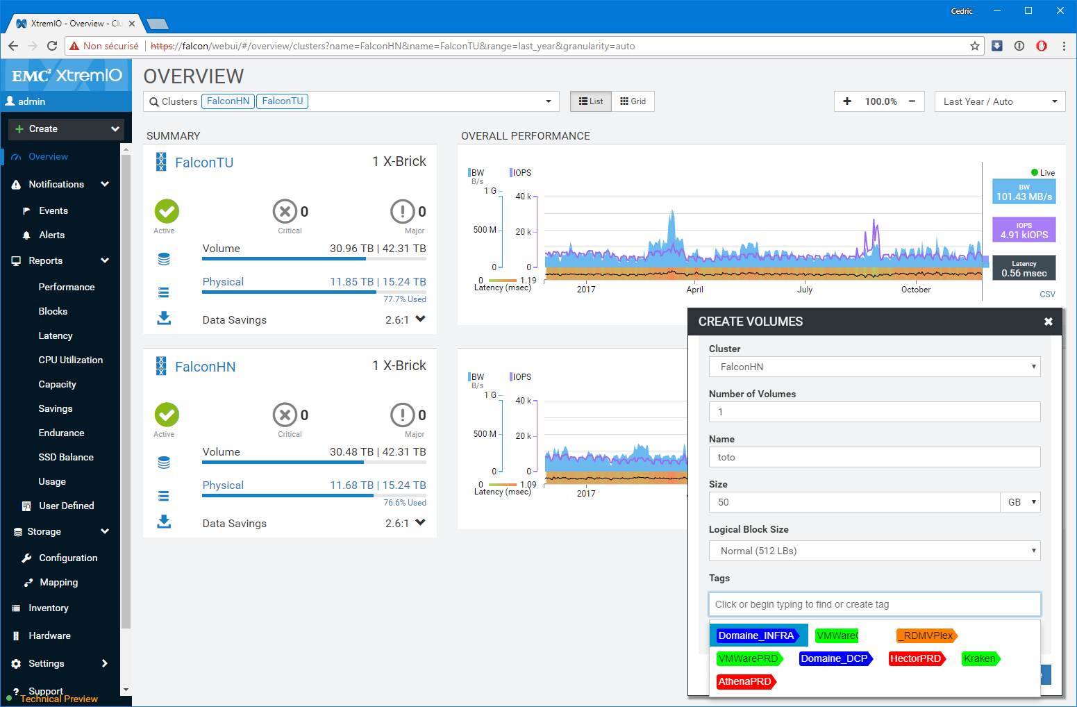 Premier bon point, les équipes de développement n’ont pas seulement réalisé un portage un-pour-un des fonctions disponibles sur l’applet Java, elles ont également grandement amélioré les fonctions de capacity planning et de monitoring (ce n’était pas un mal). Notamment, le dashboard de supervision sur lequel vous atterrissez est particulièrement bien pensé et s’adapte à la sélection réalisée. Par Défaut, l’interface présente l’ensemble des baies gérées par la XMS, mais si vous modifiez la sélection en vous focalisant sur l’une d’elles en particulier, le tableau de bord détail un peu plus le workload avec les LUNs les plus utilisées ou des graphes spécifiques de ratio IOps/Latence et BW/Latence bienvenus. D’une manière générale, c’est très ergonomique et pratique.