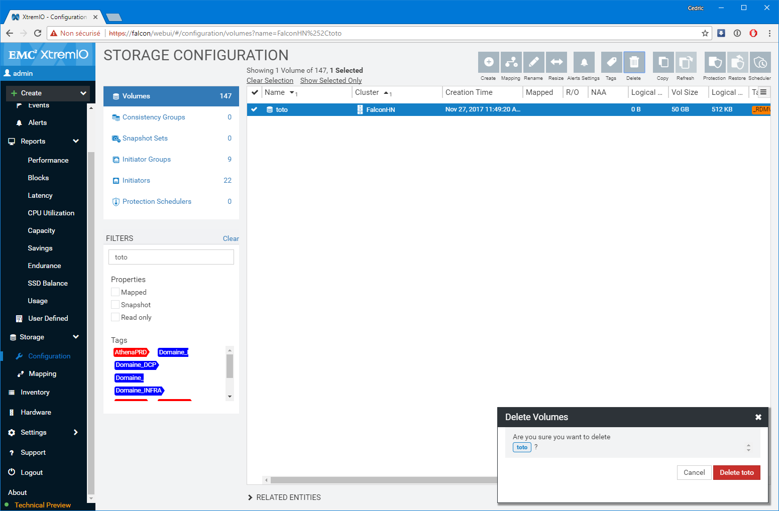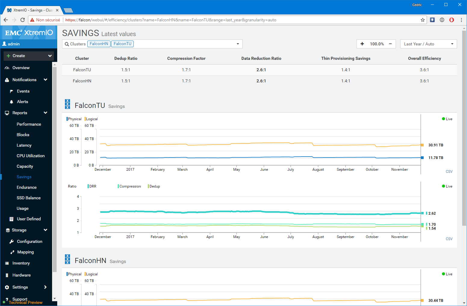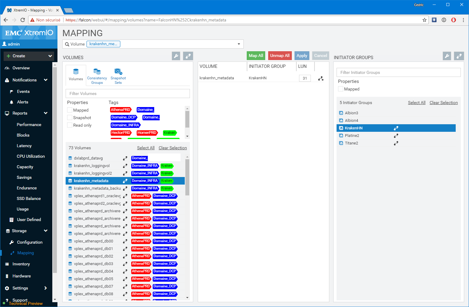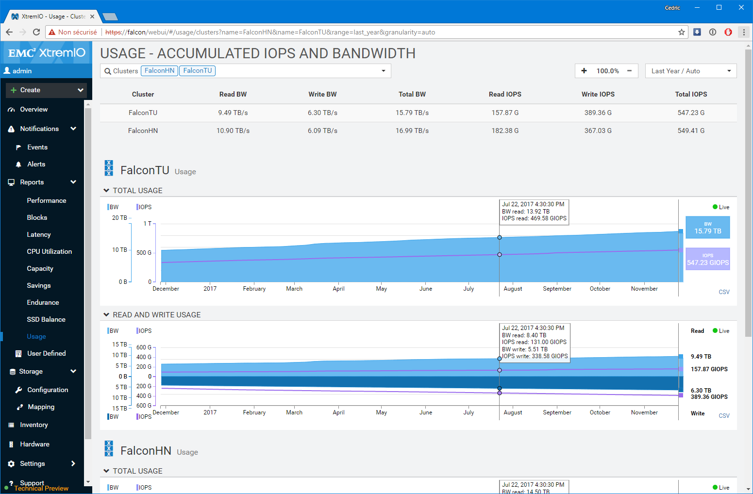 Premier bon point, les équipes de développement n’ont pas seulement réalisé un portage un-pour-un des fonctions disponibles sur l’applet Java, elles ont également grandement amélioré les fonctions de capacity planning et de monitoring (ce n’était pas un mal). Notamment, le dashboard de supervision sur lequel vous atterrissez est particulièrement bien pensé et s’adapte à la sélection réalisée. Par Défaut, l’interface présente l’ensemble des baies gérées par la XMS, mais si vous modifiez la sélection en vous focalisant sur l’une d’elles en particulier, le tableau de bord détail un peu plus le workload avec les LUNs les plus utilisées ou des graphes spécifiques de ratio IOps/Latence et BW/Latence bienvenus. D’une manière générale, c’est très ergonomique et pratique.