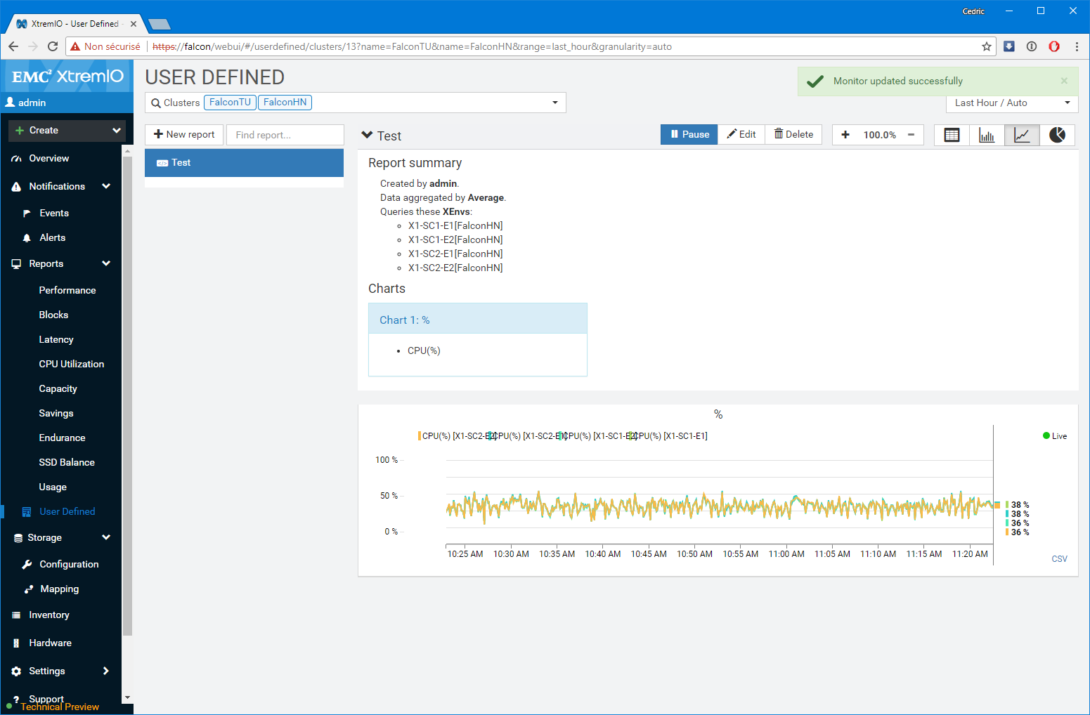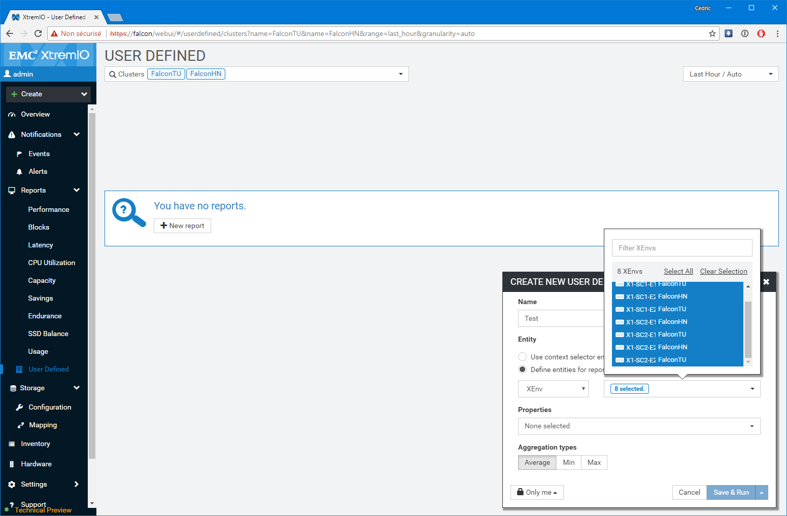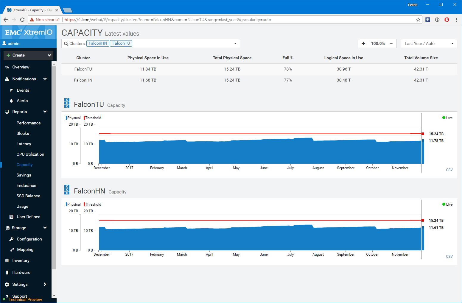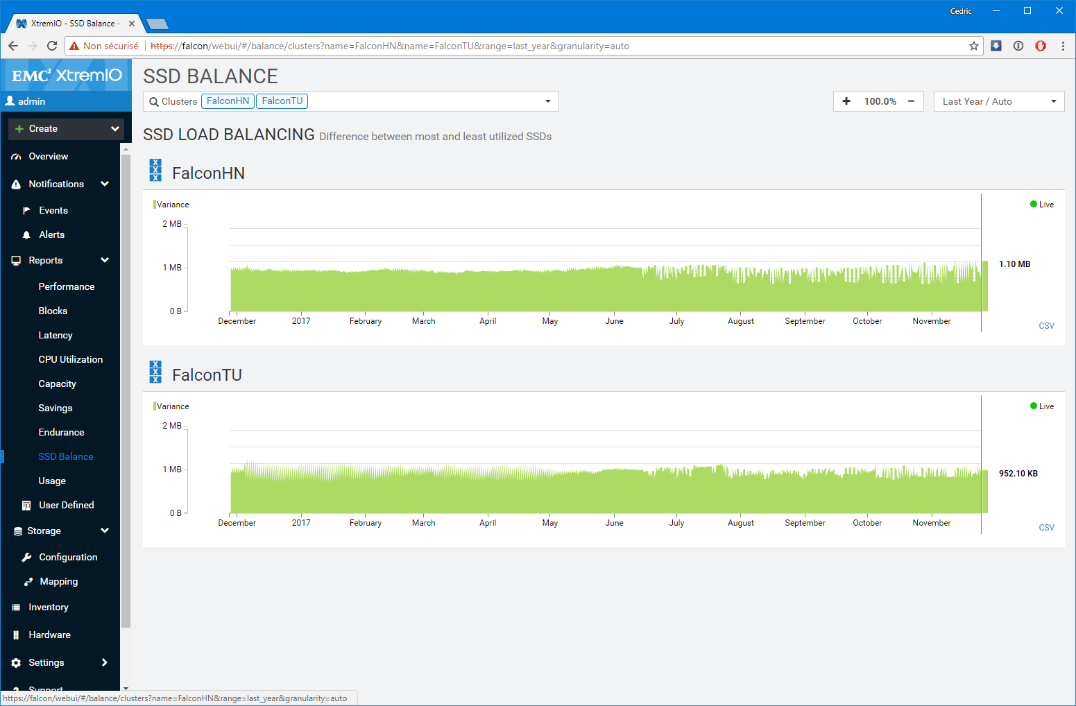 Premier bon point, les équipes de développement n’ont pas seulement réalisé un portage un-pour-un des fonctions disponibles sur l’applet Java, elles ont également grandement amélioré les fonctions de capacity planning et de monitoring (ce n’était pas un mal). Notamment, le dashboard de supervision sur lequel vous atterrissez est particulièrement bien pensé et s’adapte à la sélection réalisée. Par Défaut, l’interface présente l’ensemble des baies gérées par la XMS, mais si vous modifiez la sélection en vous focalisant sur l’une d’elles en particulier, le tableau de bord détail un peu plus le workload avec les LUNs les plus utilisées ou des graphes spécifiques de ratio IOps/Latence et BW/Latence bienvenus. D’une manière générale, c’est très ergonomique et pratique.