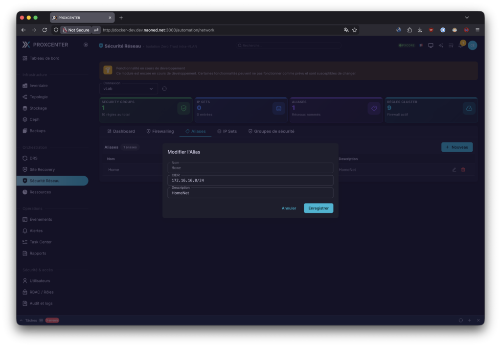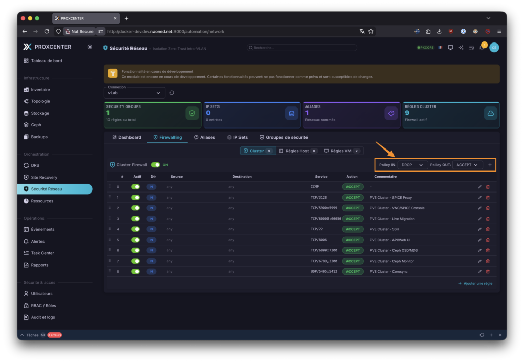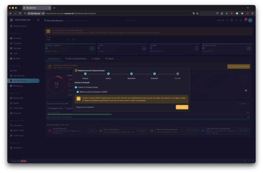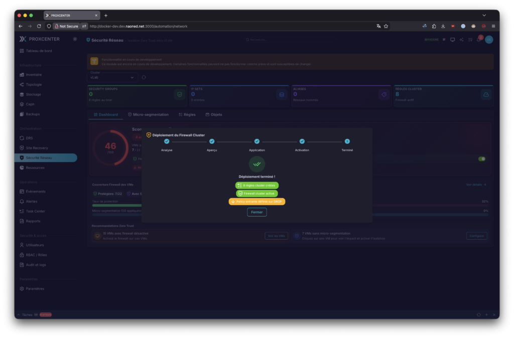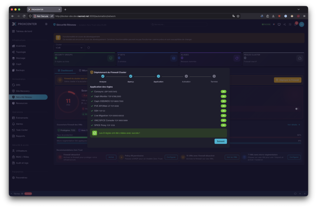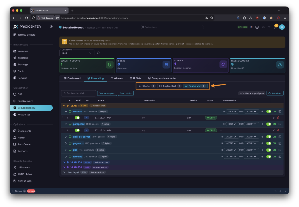 Ensuite, mon chouchou, encore en plein développement : la section sécurité réseau et micro-segmentation. Basée sur le firewall intégré de Proxmox, elle permet d’ajuster toutes les règles de filtrage d’accès de chaque nœud, VM et même globalement du datacenter, ce qui lui donne un petit air de NSX… Aujourd’hui, Emmanuel est en plein développement et en phase de fine-tuning de ces dashboards, donc les copies d’écran que je vous présente vont sûrement bien évoluer à l’avenir. Moi qui adore ça, je vous l’ai dit, j’essaie de lui donner des pistes ou des conseils, à la mesure de mes moyens, pour améliorer tout cela, avec mes connaissances de plus de 8 ans d’expérience avec NSX aujourd’hui.