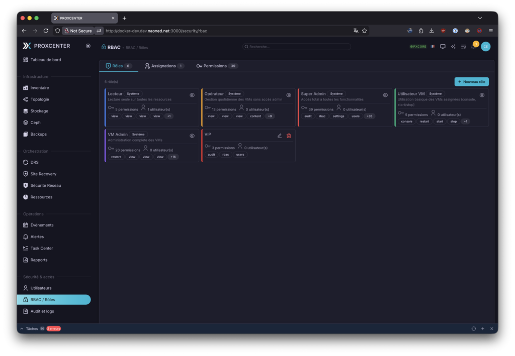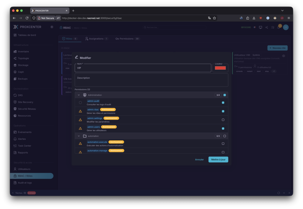 Concernant le RBAC des utilisateurs, cela reprend les permissions de Proxmox, en les présentant de manière très visuelles et plus évidentes à utiliser. J’aime !