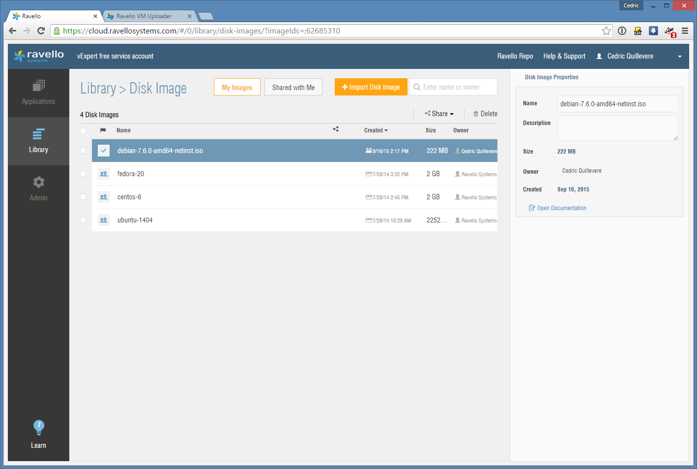 La première étape consiste donc à uploader une image de la distribution Linux Wheezy (Debian 7) chez Ravello. Pour se faire, nos hôtes ont tout prévu en mettant à disposition un outil d’importation générique « VM Import tool » qui vous permet de récupérer aussi bien une image iso classique qu’une OVA déjà packagée ou même une importation d’une VM directement depuis votre vCenter ! Ici, nous allons nous contenter (je vous laisserai découvrir les autres possibilités vous-mêmes…) d’uploader l’image iso debian7. Une fois l’outil en question installé (il existe une version Linux, Windows et Mac OS … que demande le peuple !), on suit bêtement les instructions et tout se passe de manière fluide. La seule chose à vérifier, c’est de disposer d’un accès au Net sans trop de contrainte (je ne sais pas si VM Import Tool est capable de supporter les proxys). Au bout de quelques temps, vous allez retrouver votre image directement dans la section Library->Disk images.