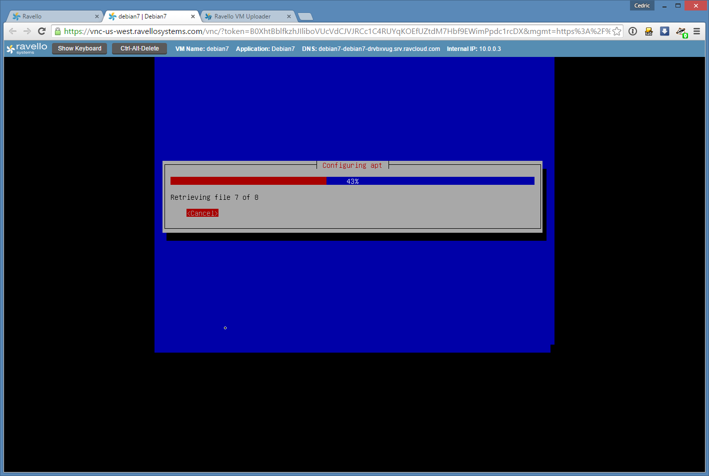 « Up and running » ! On va pouvoir utiliser cette nouvelle ressource. La connexion à la console de la VM est très simple, via un bouton dédié dans l’interface. La encore, j’insiste lourdement sur l’aspect fluide de l’ensemble du framework, en dehors du VM Import Tool, tout le reste se fait sur un navigateur HTML5 et POINT ! Pas de java, pas d’ActiveX, pas de Flash (VMWare, tu nous entends, là ?) … et l’ergonomie en prime, un régal. J’anticipe la question : non je n’ai rien reçu de Ravello Systems, ni en cash ni en nature 🙂 . Une fois sur la console, le reste est traditionnel et je ne m’étendrai pas dessus : l’installation se déroule sans accro. La réactivité de la machine est très bonne, sans surprise.