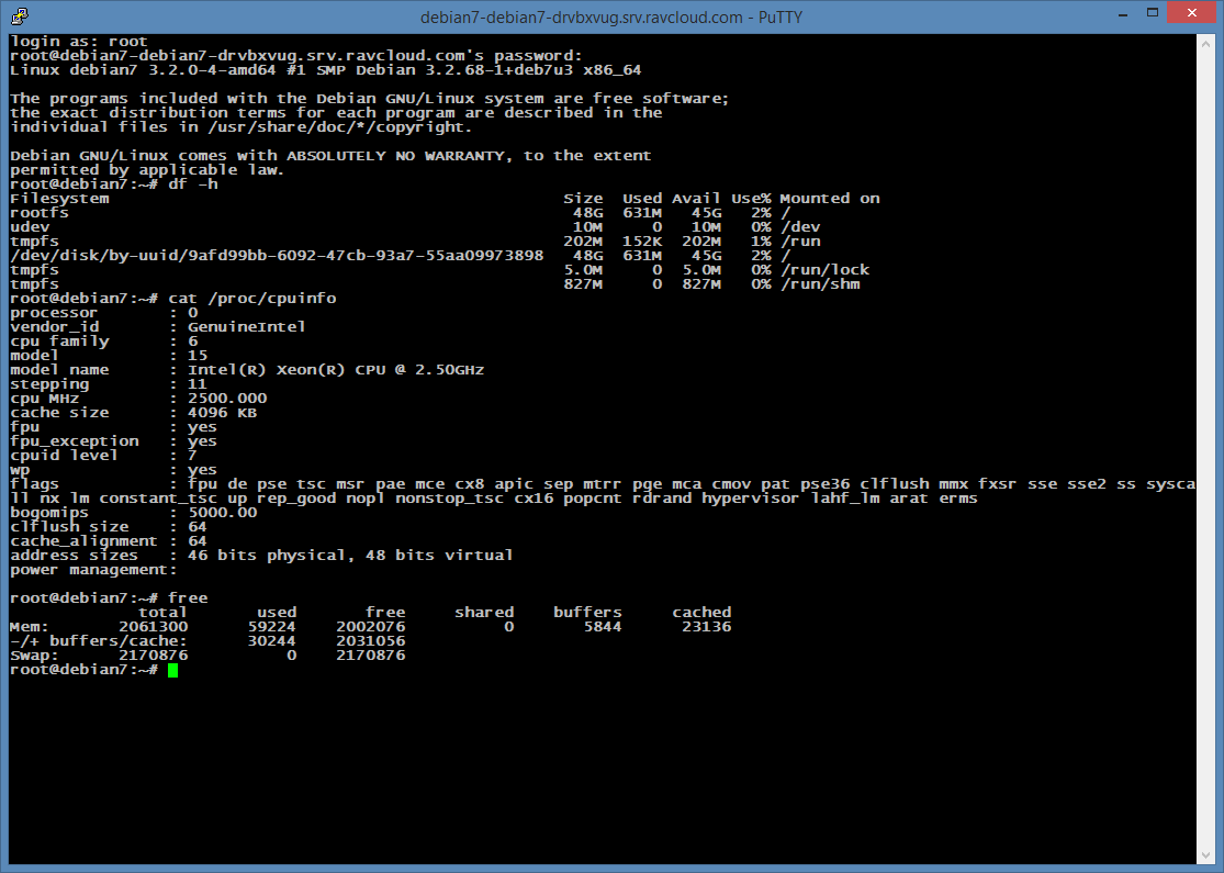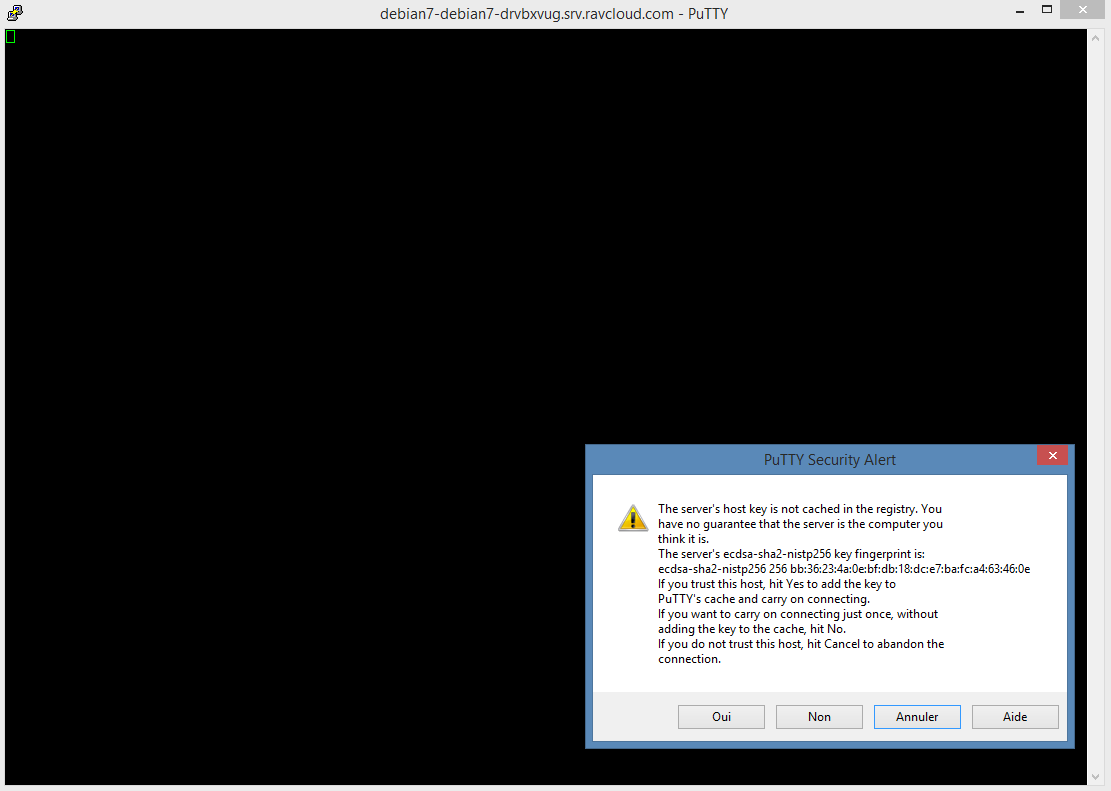 Enfin, clou du spectacle, une fois la machine opérationnelle et grâce à toute la pré-installation de l’environnement (DNS, DHCP etc. …) vous pouvez dors et déjà vous connecter en SSH depuis le net au host dynamique fourni par Ravello, ici debian7-debian7-drvbxvug.srv.ravcloud.com. Si nous avions créé d’autres services comme du HTTP/HTTPS ou de l’IMAP, par exemple, de la même façon, ces protocoles auraient été accessibles directement via ce FQDN généré à la volée.