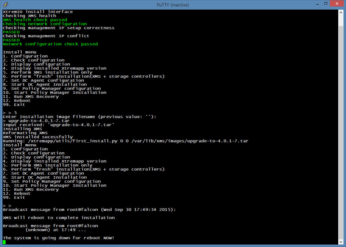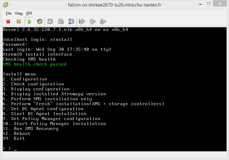 Il s’agit maintenant d’initialiser la XMS avec la version d’XtremIO cible. Commencez d’abord par uploader le fichier du software dont nous avons parlé plus haut en utilisant un outil de copie compatible SFTP comme SCP sous Linux, FileZilla ou WinSCP au choix. Le compte à employer pour cette étape est « xmsupload », mot de passe « xmsupload ». Déposez le fichier en question directement dans le répertoire par défaut du compte xmsupload. Ceci terminé, il suffit de lancer l’installation via le menu « 5. Perform XMS installation only ». L’appliance va vous demander le nom du fichier d’archive, sans son chemin. Rentrez, tel quel, le nom du fichier, par exemple pour notre version 4.0.1-7