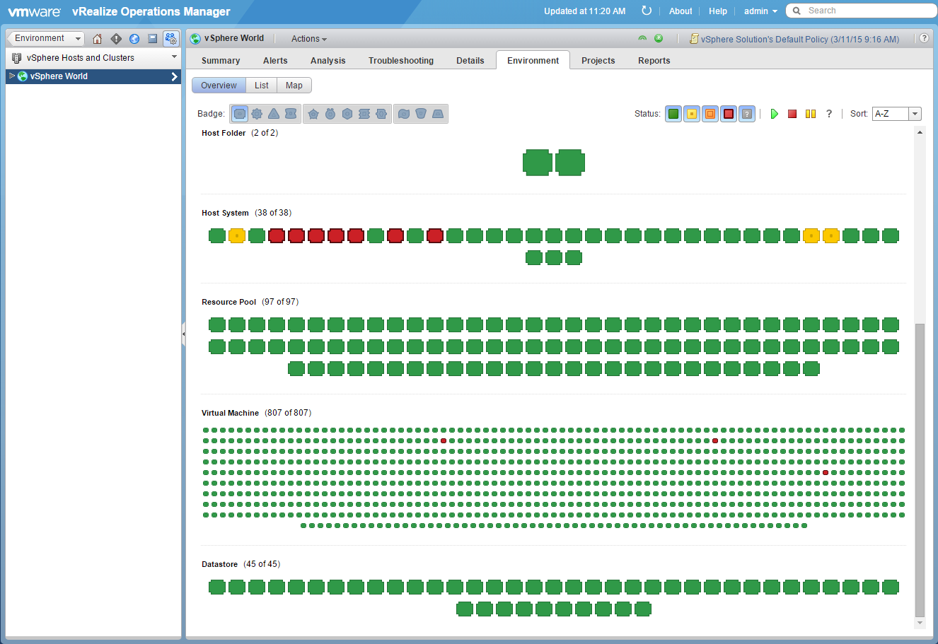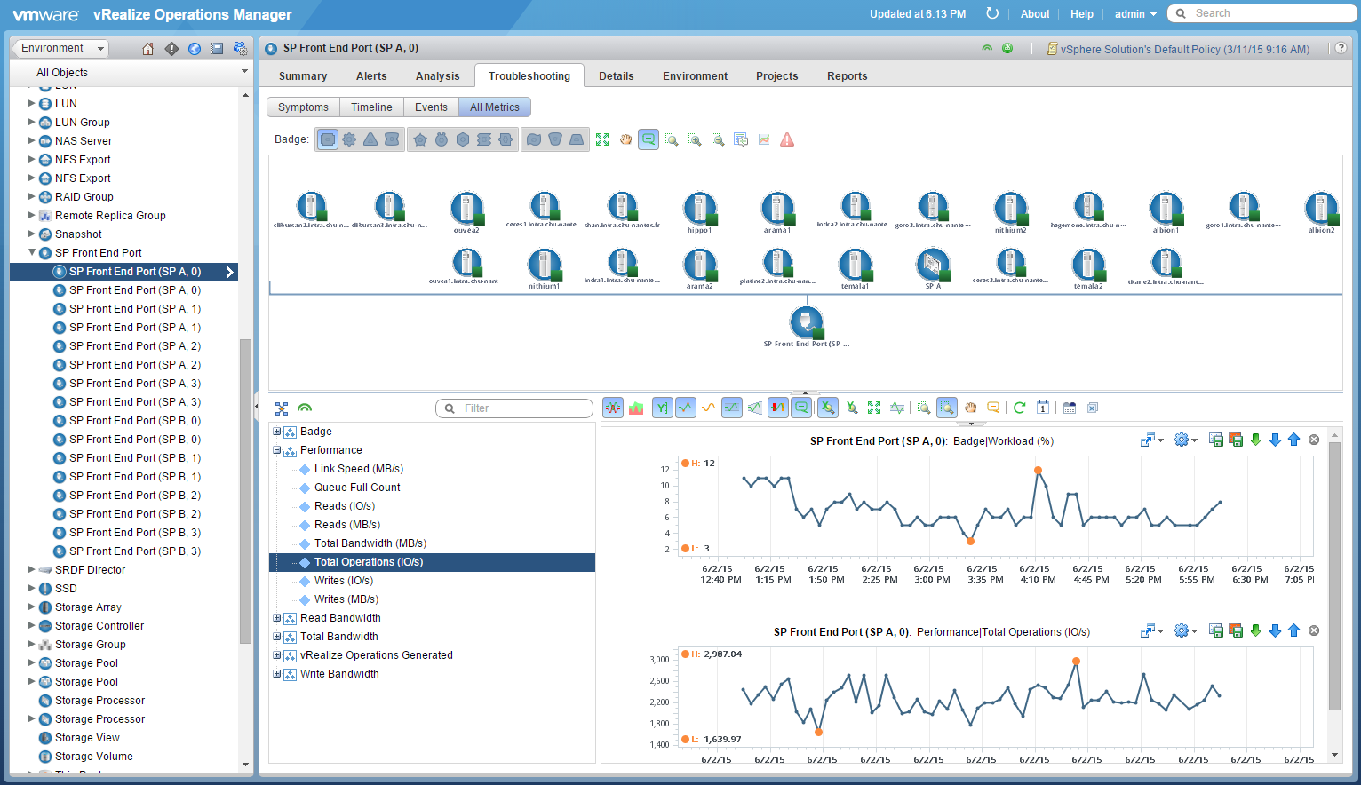A partir du moment où vos baies sont configurées, la collecte commence. Le mieux est de laisser à vRO le temps de récolter quelques heures de statistiques pour se faire une idée du potentiel du produit. A l’issue, on peut commencer à explorer les metrics remontés. Ces sondes diffèrent d’un équipement à l’autre évidemment, mais il y a tout de même un certain nombre d’indicateurs universels, qui sont intrinsèquement liés à vRO : les badges et les alertes. En effet, c’est le cas pour tout élément intégré à Operations, quel qu’il soit.