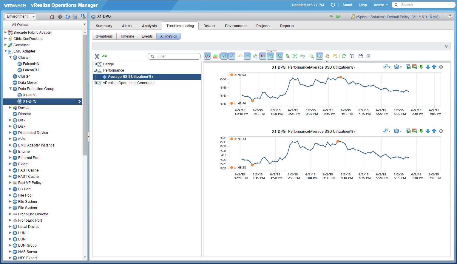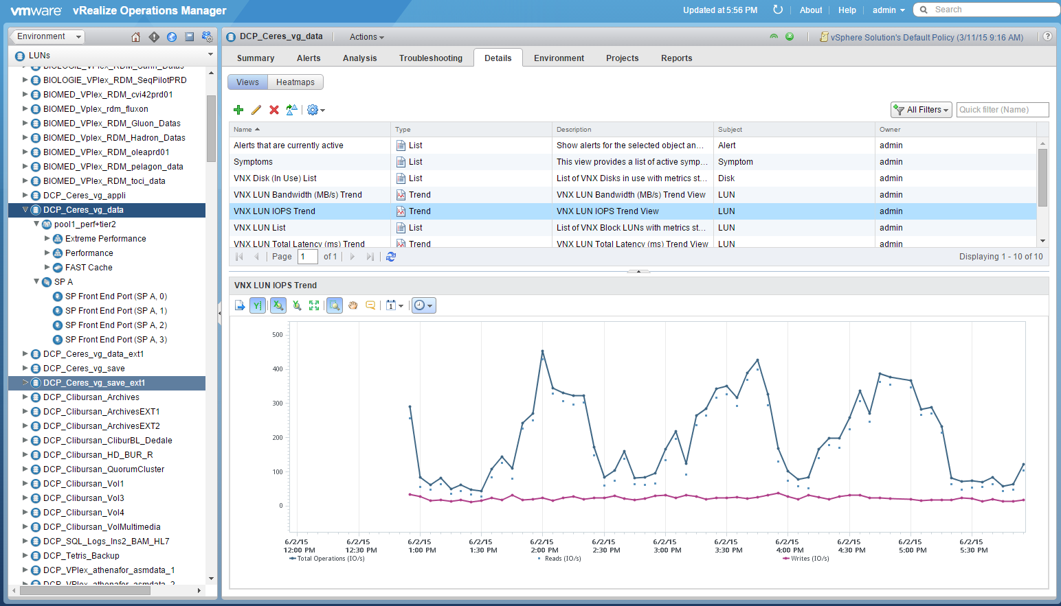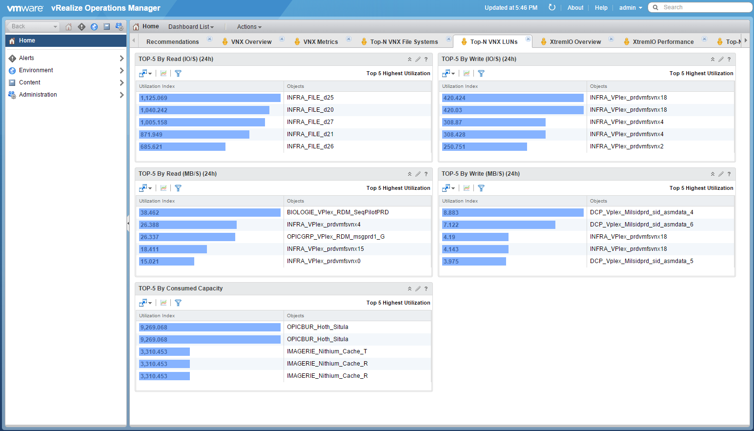 Nous utilisons VNX Monitoring & Reporting depuis environ 1 an au sein de notre institution. Nous avions donc, pour nos VNX 7500, un bon élément de comparaison pour juger de l’apport potentiel de ESA par rapport à une autre solution déjà en place. Dans l’ensemble, on retrouve beaucoup des metrics mis en forme par VNXMR dans l’interface vRO :