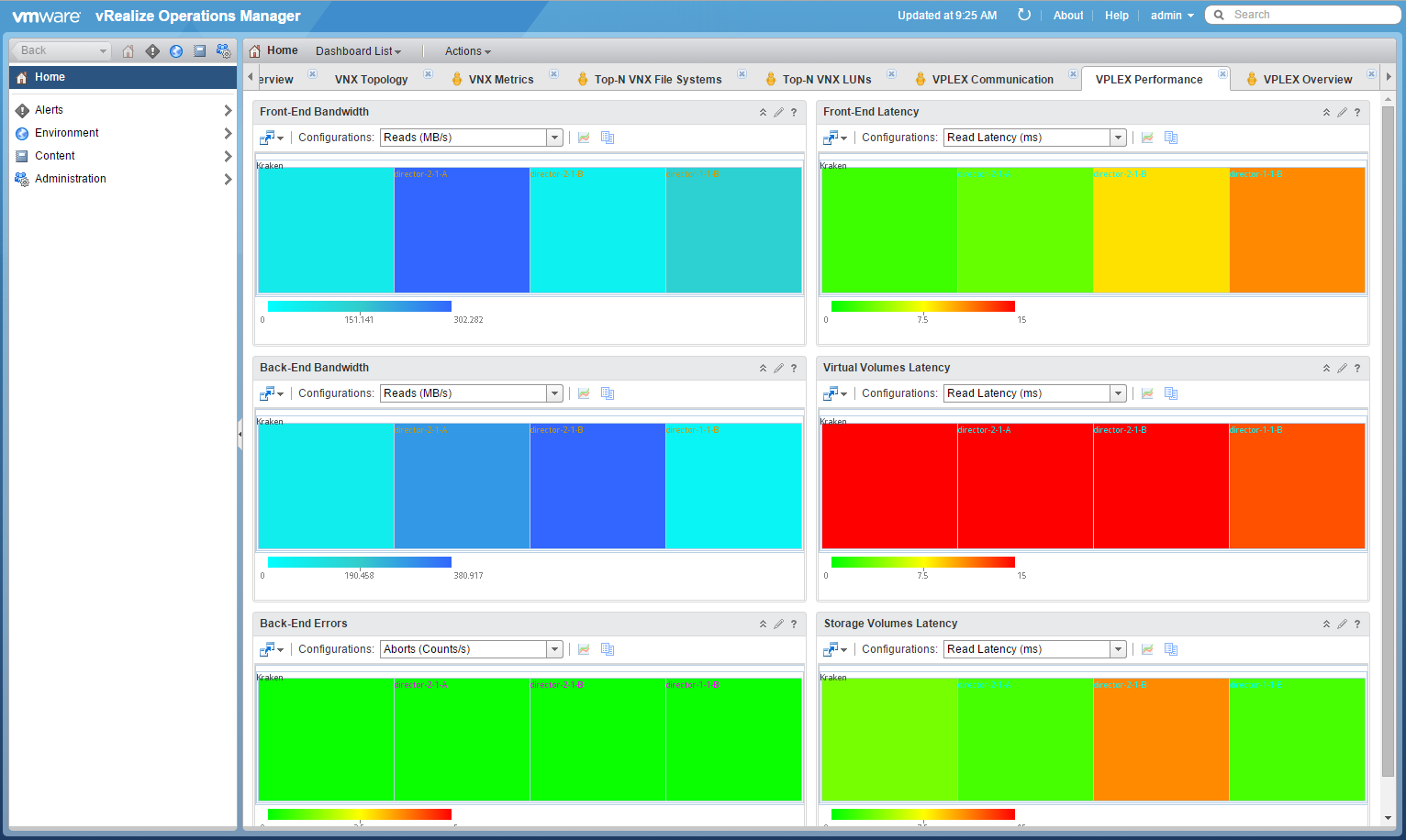 Du coté de VPlex, encore une fois, là où l’interface Unisphere for VPlex apportait une visibilité temps réelle, ESA y ajoute une consolidation long terme et un suivi précis et historisé de l’activité de chaque composant. Les heatmaps sont particulièrement bien pensées, même si certaines d’entre elles comme les niveaux de latence me paraissent « bizarres ». Là ou ESA remonte des latences de plus de 35 à 40 millesecondes, dans la pratique cela ne concerne effectivement que quelques LUNs spécifiques sur des disques lents et qui plus est, particulièrement sollicités. Pour le coup, j’ai l’impression que les indicateurs de latences « globaux » traduisent les pires situations et pas une situation médiane. Ce point mérite un peu plus d’investigation, je pense :