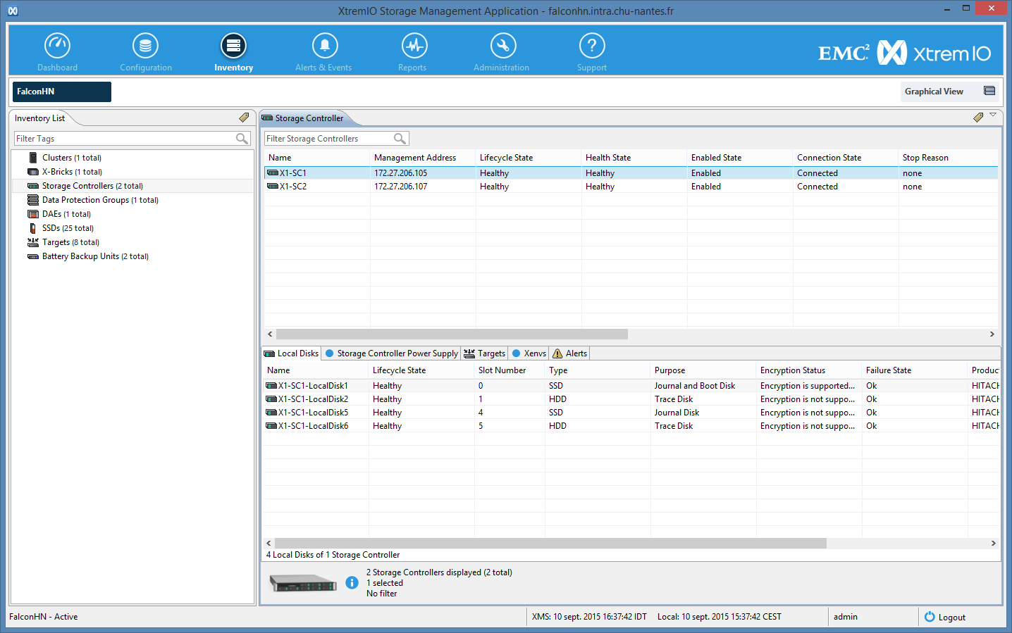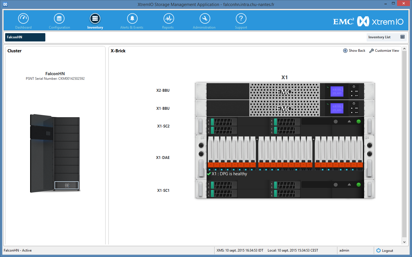 Coté Inventaire, là, la présentation de base reste grosso modo la même qu’auparavant avec un visuel des composants hardware, mais vous disposez malgré tout d’une nouvelle vue par liste de ces mêmes composants sans doute plus adaptée aux grosses configurations avec 2,4 ou même 8 X-Bricks par cluster.
