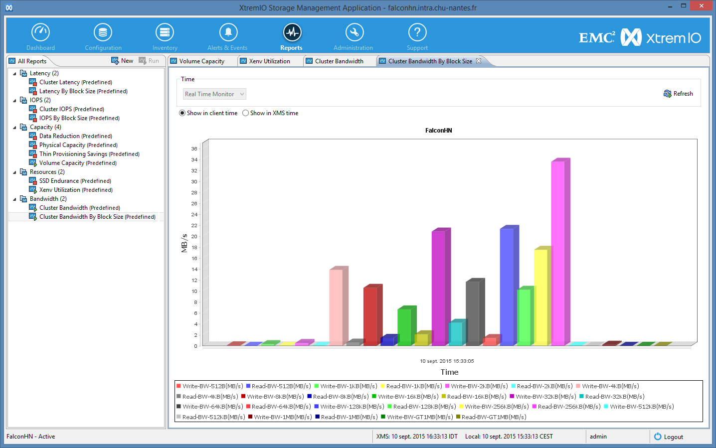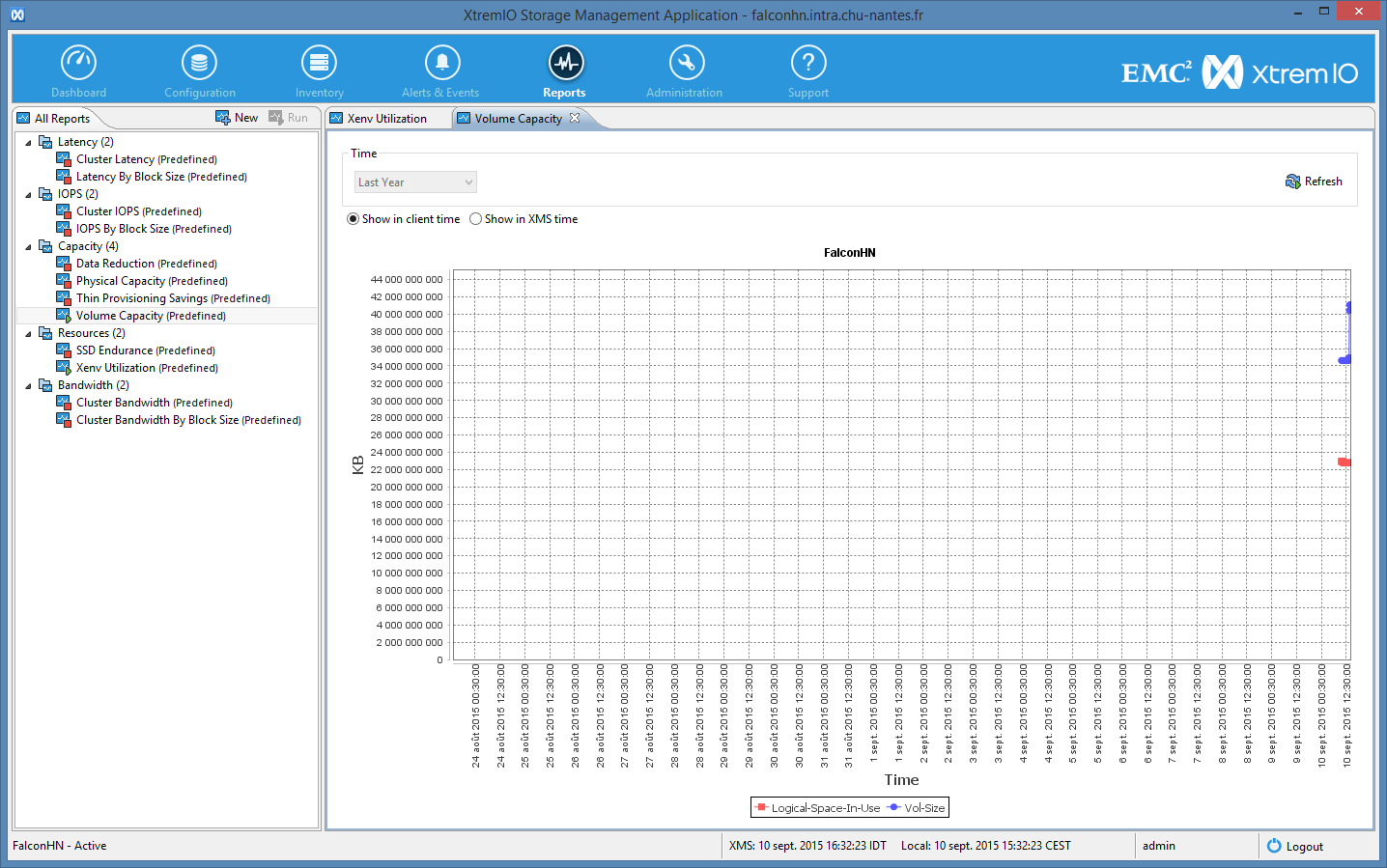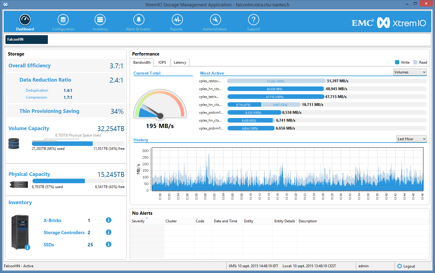 La fenêtre de login reprend la nouvelle charte, plus épurée. Une fois dans l’interface, on remarque tout de suite certaines évolutions : sous la barre des grandes sections (Dashboard, Configuration, Inventory etc. …) se trouve désormais une liste de boutons représentant chacun les différents clusters XtremIO connectés à la XMS. En effet, parmi les grandes nouveautés, il est possible désormais de piloter plusieurs clusters via une seule et même console. D’autre part, on constate aussi que la section « Inventory » en bas à droite a été revue pour prendre en charge les multi-clusters.