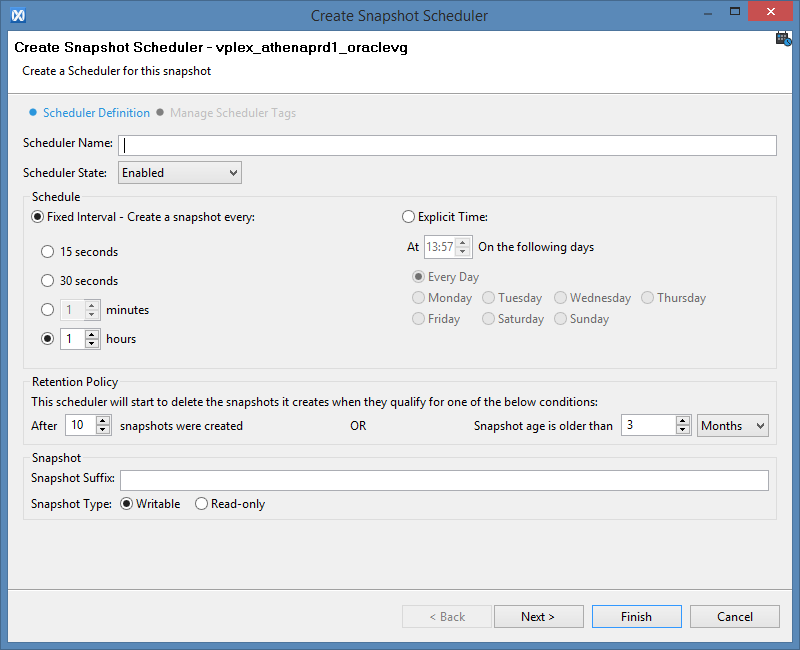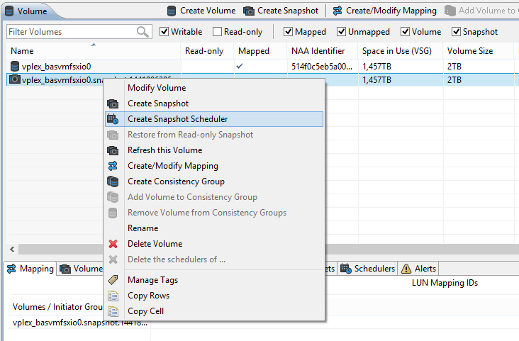 Il existe aussi maintenant ou scheduler de snapshots, qui permet de créer de manière automatique et régulière des snaps et de gérer leur cycle de vie (suppression au bout d’un certain temps ou après X snapshots posés). Etant donné le fonctionnement général d’XtremIO, cela ouvre des possibilités encore inconnues en matière de protection de la donnée : vous pouvez littéralement réaliser des snaps de toute votre production toutes les 30 secondes sur une période de 24h et les rejouer instantanément avec la fonction revert en cas de problème (A chaque snap ne correspond qu’une copie de références au sein de la table des metadata du cluster (aucune copie de donnée quelconque n’est réalisée physiquement sur la baie).