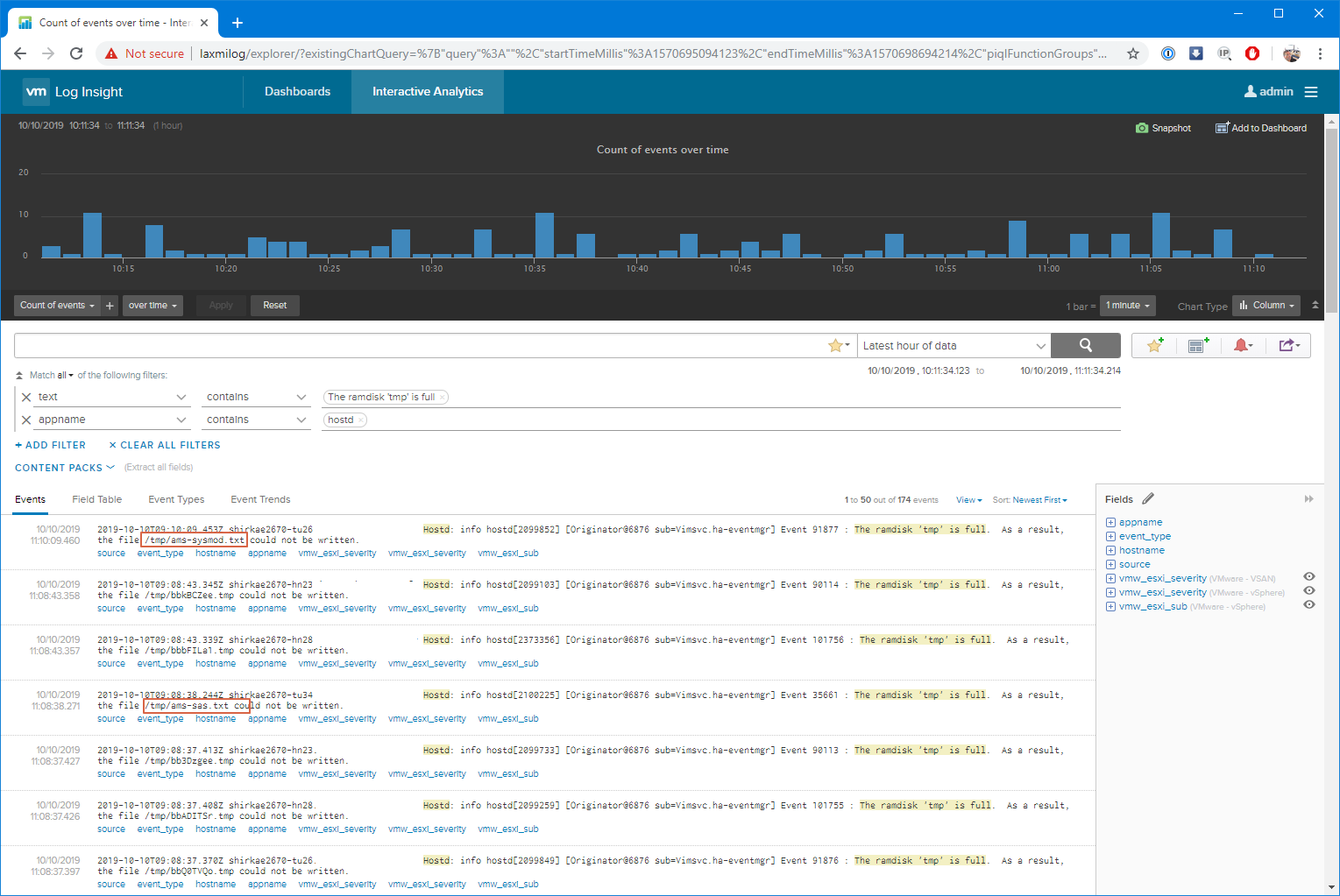 En attendant, j’ai été obligé de monter un petit dashboard Log Insight pour superviser spécifiquement le symptôme le plus commun qui présage un futur plantage ou un souci d’administration sur les ESXi « HP » (et nous en avons beaucoup…).