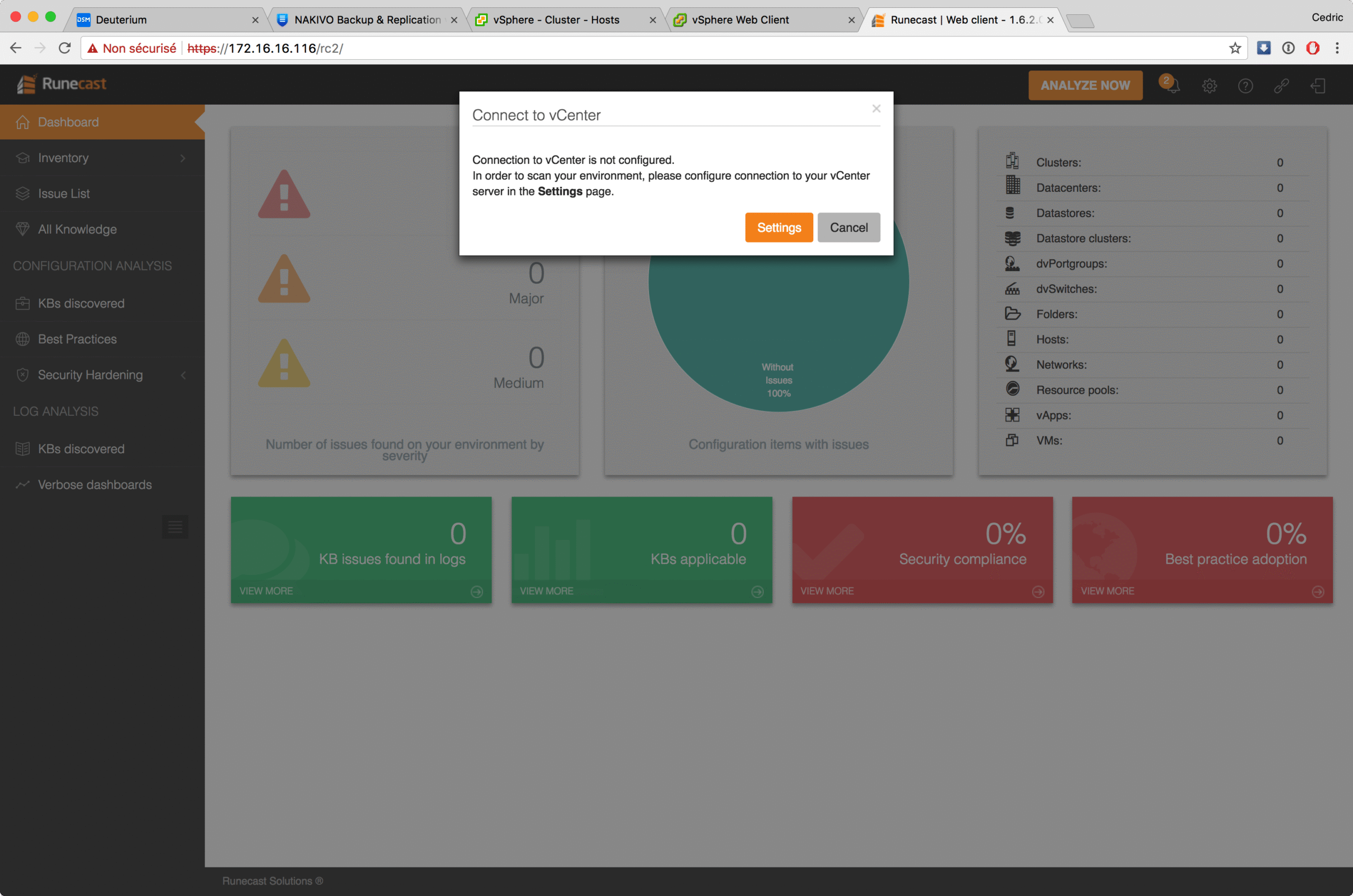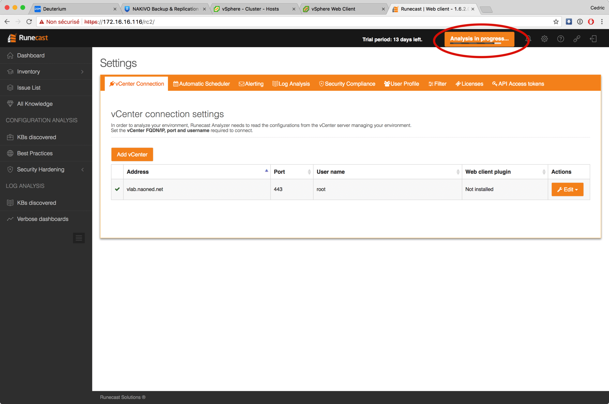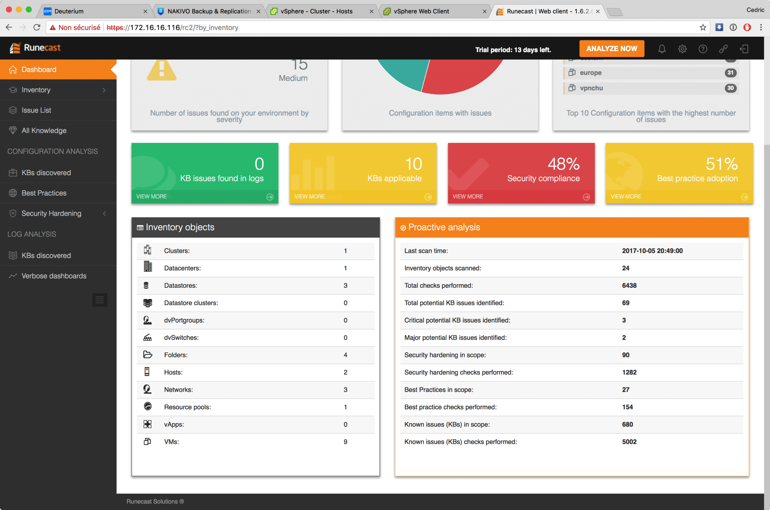 Livré sous forme d’OVA – c’est la norme aujourd’hui – l’environnement Runecast s’installe en quelques minutes et propose, à l’issue, un portail web pour découvrir tout le potentiel du logiciel. Une fois connecté, vous renseignez les coordonnées d’accès à votre/vos vCenter(s) et … vous lancez l’analyse bien sûr 😉