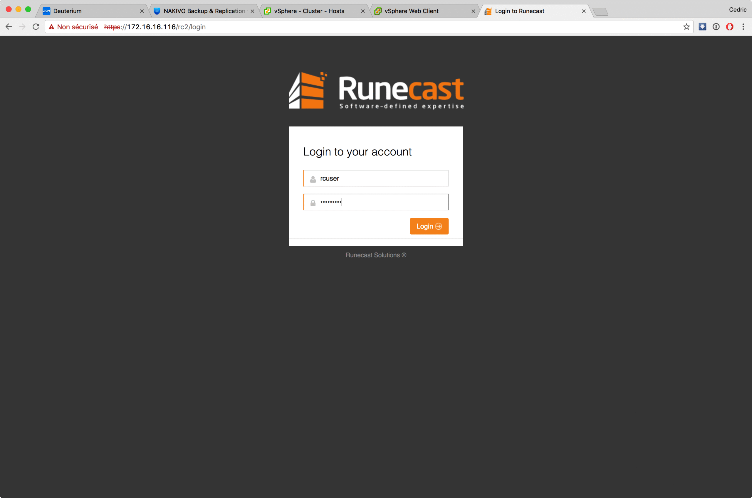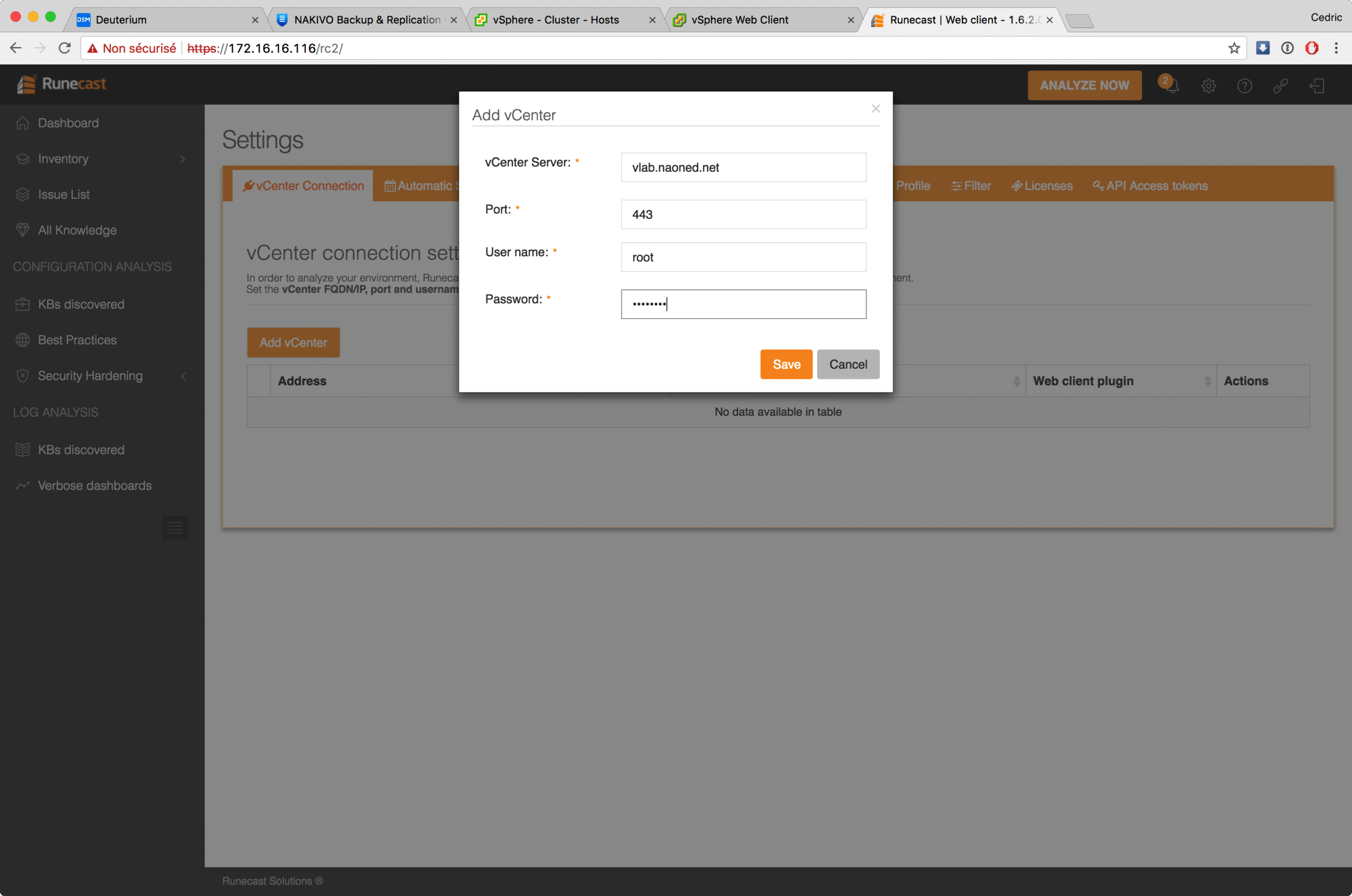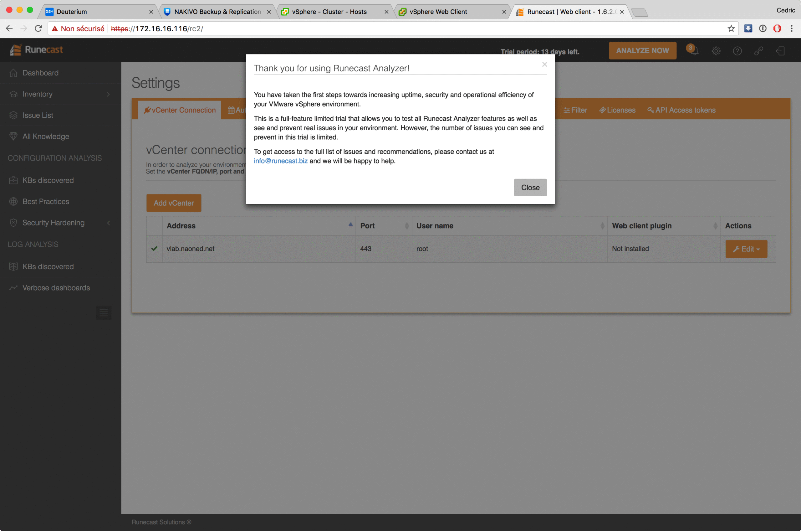 Livré sous forme d’OVA – c’est la norme aujourd’hui – l’environnement Runecast s’installe en quelques minutes et propose, à l’issue, un portail web pour découvrir tout le potentiel du logiciel. Une fois connecté, vous renseignez les coordonnées d’accès à votre/vos vCenter(s) et … vous lancez l’analyse bien sûr 😉