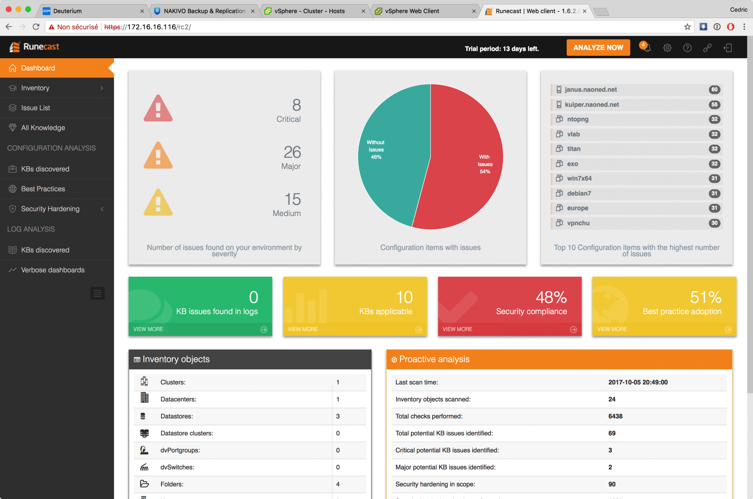 Oui, alors, bon, effectivement, le moins qu’on puisse dire c’est que Runecast fait peur… en première lecture ! Après une analyse très rapide (moins de 5 minutes pour 1500 VMs et 45 hyperviseurs), le dashboard qui vous est présenté est assez, comment dire, anxiogène ^^. Le fait est que même si les « problèmes » trouvés sur votre infrastructure sont tous pondérés par un niveau de priorité, à la manière des vulnérabilités classiques (CRITICAL, MAJOR, MEDIUM, LOW), globalement l’interface produit son petit effet.