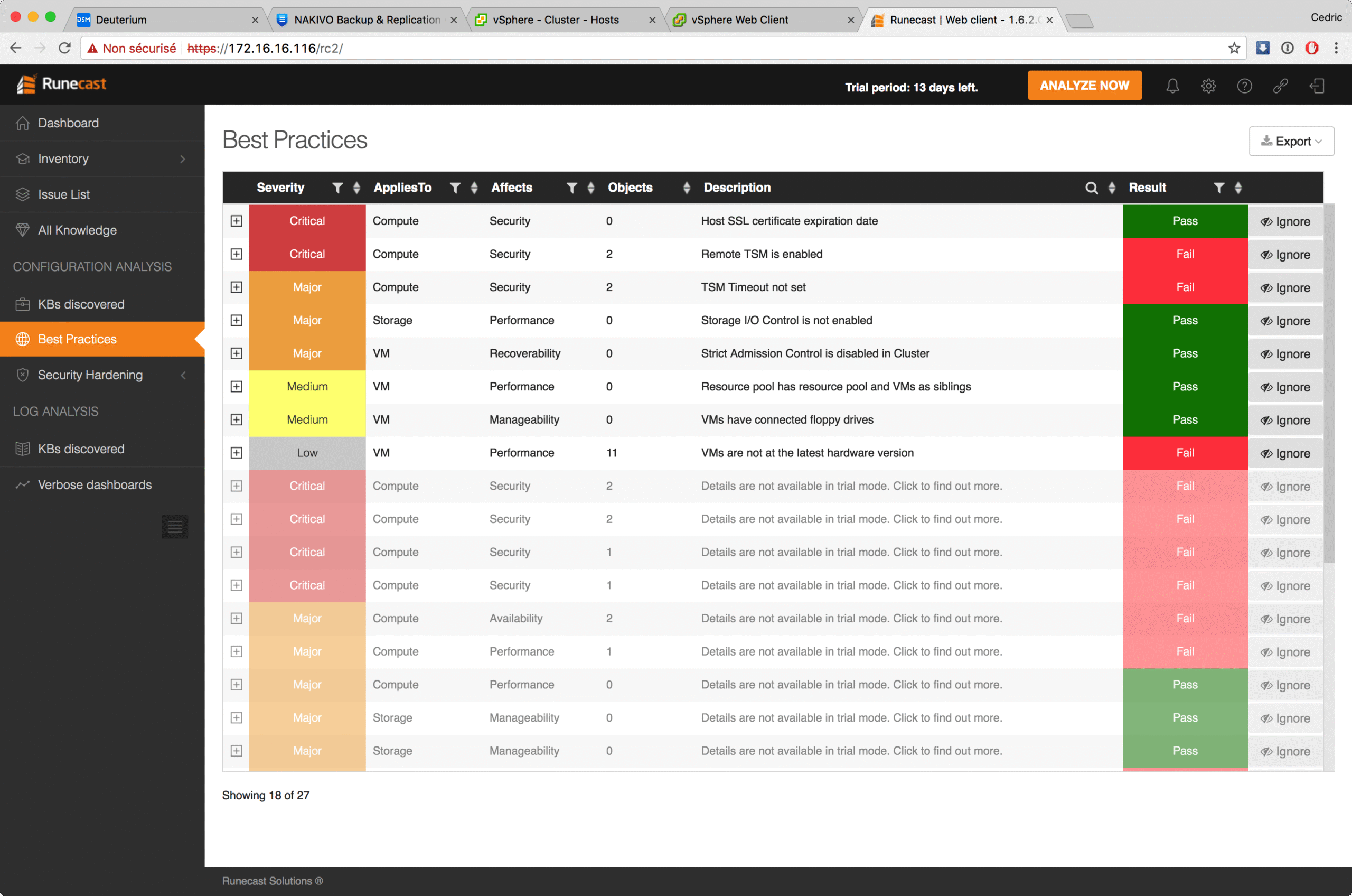 Passé ce premier choc, il s’agit de prendre du recul (comme toujours), et analyser plus posément les résultats. Force est de constater que le produit est très bien fait de ce point vue. En face de chaque alerte, vous disposez d’un bandeau expliquant la source de celle-ci et surtout le contexte et les éléments qui ont provoqué cette détection. Vous disposez aussi de plusieurs sections qui mettent l’accent sur certains aspects de l’analyse : « issue list » par exemple, recensera l’ensemble des alertes, quand « security hardening » ne vous affichera que des recommandations de sécurité (comme la désactivation de l’accès SSH de vos serveurs ou l’activation du lockdown). Une section spécifique très intéressante présente aussi l’ensemble des alertes relatives aux KB VMware et concerne forcément plus les aspects correctifs de stabilité ou de fonctionnement général. Elle peut être un guide particulièrement pertinent pour vous focaliser sur la fiabilité générale du vos ESXi sans pour autant passer vos journées à lire les KB détaillés pour savoir s’ils vous concernent.