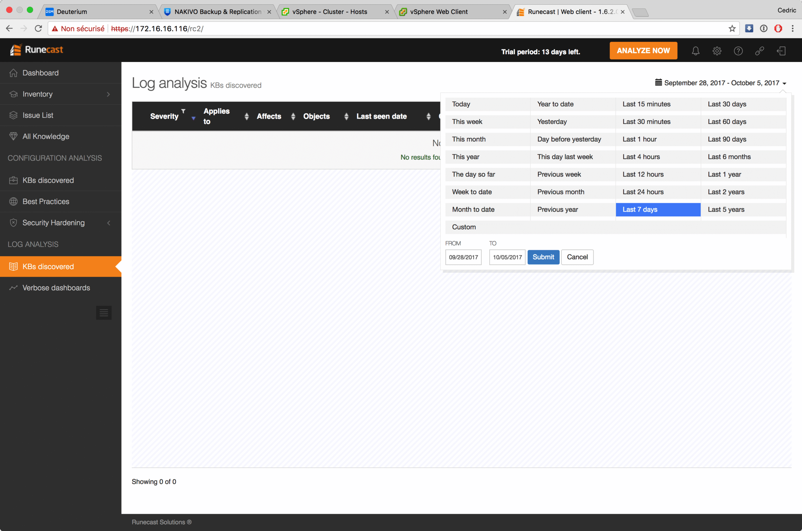 Runecast est également capable de suivre vos environnements sur la durée. La section « log analysis » permet de repérer les nouvelles détections de non conformité au cours du temps de manière par exemple à se focaliser au quotidien sur les choses importantes sans être noyé dans la masse des alertes globales que vous pouvez décider de mitiger en mode « traitement de fond » par ailleurs.