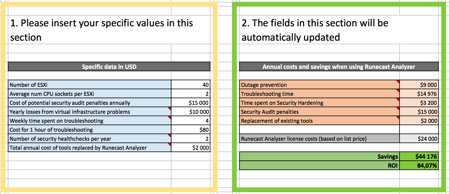 Runecast propose un petit document Excel permettant de calculer le ROI de leur solution. Certes, les inputs sont sans doute assez favorables pour l’éditeur. Néanmoins, pour une quarantaine de serveurs, le tableau calcule un coût total d’investissement de $24000, ce qui place la licence « au serveur ESXi » à environ $600. De mon point de vue, c’est tout à fait raisonnable au regard du temps économisé et surtout du potentiel de reporting factuel et surtout exhaustif. Ce faisant, le logiciel a toutes les qualités pour impressionner la chaîne de direction, RSSI compris. Revers de la médaille, c’est le défaut de ses qualités, il obligera de facto les services de production/MCO à un travail plus important et régulier d’entretien de la conformité… c’est le prix de la sécurité !