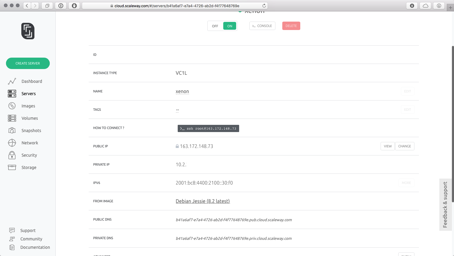 Seconde originalité : vos serveurs ne portent pas nativement d’IPv4 publique mais une IPv4 privée. Lors de la création de la machine, vous pouvez choisir d’en réserver une spécifique … ou pas ! En somme on peut tout à faire imaginer mettre en place des serveurs frontaux diposant d’une connectivité publique, quant des serveurs back-end ne sont accessible que via le réseau privé de Scaleway. La conséquence de la non adhérence des serveurs avec leurs IPv4 publiques c’est que vous pouvez « faire suivre l’ip publique » d’une machine A vers une machine B (reprenez l’exemple de l’upgrade d’un serveur, l’IPv4 suit aussi … que du bonheur pour vos enregistrements DNS !)