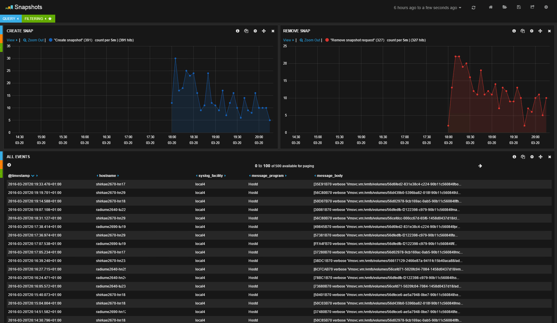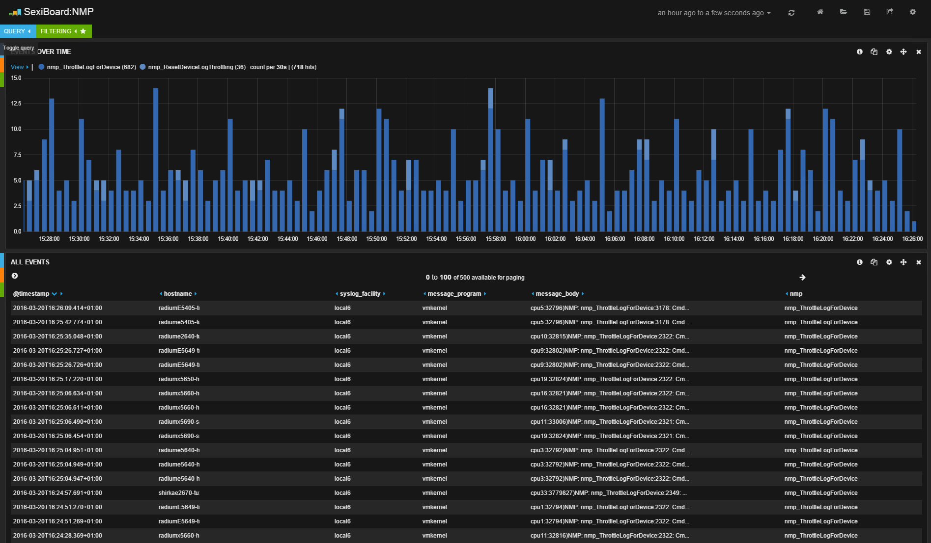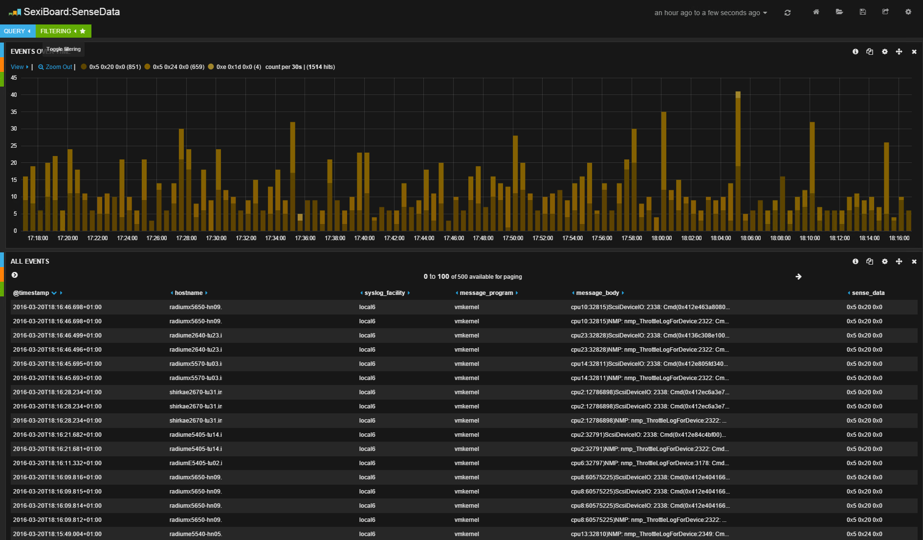 Ensuite, pour la supervision, il vous suffit de vous connecter à l’interface « tableau de bord » (le composant Kibana), ainsi, logguez-vous au portail web en pointant votre navigateur sur l’URL http://IP_de_la_vm_sexilog. Vous arrivez sur un dashboard par défaut recensant le nombre d’événements reçus sous forme d’histogramme ainsi que la liste des 50/100 derniers. SexiLog est clairement dédié à la supervision VMWare, même si techniquement, vous pouvez lui envoyer bien d’autres type de logs. A ce titre, vous disposez d’une liste déjà bien fournie de tableaux de bord présentant des extractions de logs spécifiquement conçus pour vous apporter une visibilité particulière sur certains type d’événements ou certains niveaux de criticité. Voici quelques copies d’écrans de tableaux de bord intégrés (après quelques heures de récolte sur notre production) :