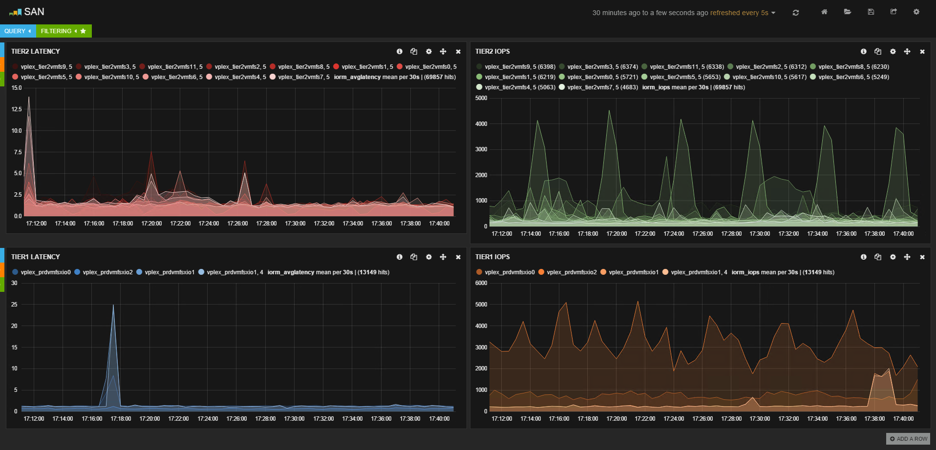 Il existe aussi des dashboards plus spécifiques qui nécessitent de modifier un peu le comportement de vos ESXi en matière de « verbosité » sur les logs qu’ils envoient à SexiLog. En particulier, il est possible (voir le billet suivant sur Hypervisor.fr) de récupérer des statistiques de performances de votre stockage VMWare en quasi temps réel (toutes les 4 secondes). Après modification de configuration de vos ESXi, vous pourrez recevoir ce type de messages et les exploiter pour en faire des graphiques. L’éditeur de tableau de bord est particulièrement bien pensé et après une petite phase d’adaptation et de compréhension de la logique, j’ai pu développer un tableau de bord dédié qui présente les IOps et les latences de chaque datastore pour nos environnements TIER1 et TIER2, et tout cela en temps réel ! Quelle confort avancée par rapport à tous nos outils existants !