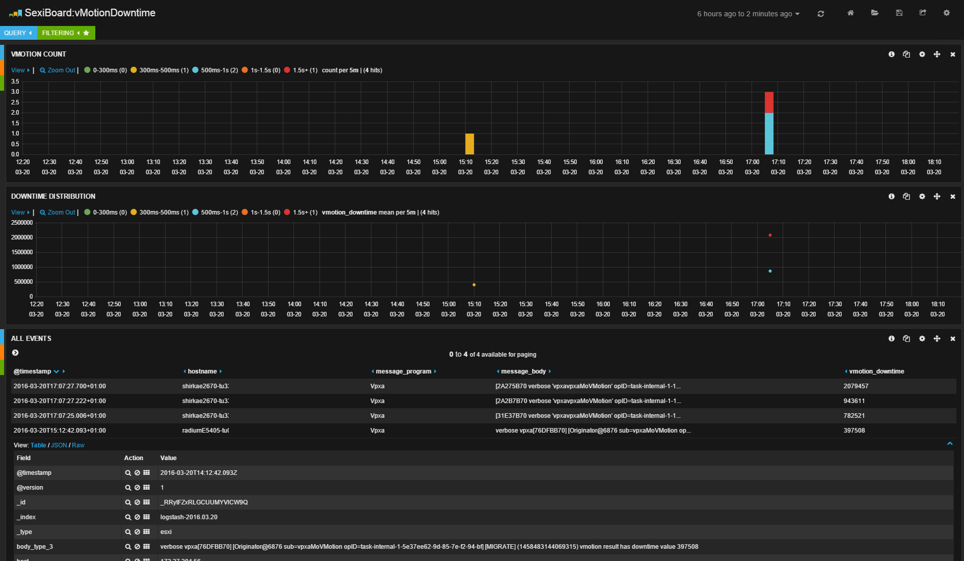 Clairement, les possibilités sont assez énormes et SexiLog s’approche de la perfection pour de la supervision « live » de votre production. De plus, en dehors du strict point de vue du monitoring en temps réel, il est aussi possible d’utiliser SexiLog pour réaliser des diagnostics très précis et pointus notamment autour du comportement des serveurs ESXi et de leurs alertes. Enfin, grâce à la masse d’événements reçus, on peut envisager aussi de réaliser de la corrélation de logs pour extraire une faiblesse ou des problèmes de paramétrage qui dépassent le cadre de chaque machine physique. Par exemple, avec des tableaux de bord comme celui du « VMotion DownTime ». VMotion est, comme vous le savez sans doute, une des fonctions avec Fault Tolerance qui réclame la synchronisation et la communication la plus parfaite entre le serveur source et le serveur cible. Le « downtime » donne une visibilité précise exprimée en milli-secondes du temps d’indisponibilité réel de chaque VM déplacée, entre le moment ou la session de migration démarre et le moment ou la VM tourne désormais complètement sur la cible. Un downtime VMotion élevé peut révéler des problèmes spécifiques sur votre réseau ou des difficultés pour vos ESXi d’absorber cette charge complémentaire, même temporairement.