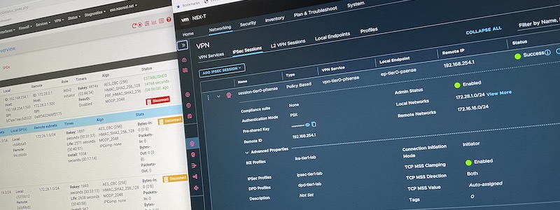 Notre production NSX-T évolue et s’adapte de plus en plus à toutes nos contraintes opérationnelles. Récemment, il nous a fallu préparer l’arrivée d’une interconnexion entre des segments et un prestataire externe chargé de la supervision des machines connectées. Il a donc fallu se plonger rapidement dans le fonctionnement et l’implémentation d’IPsec pour mettre en place les tunnels associés. C’est comme si c’était fait !