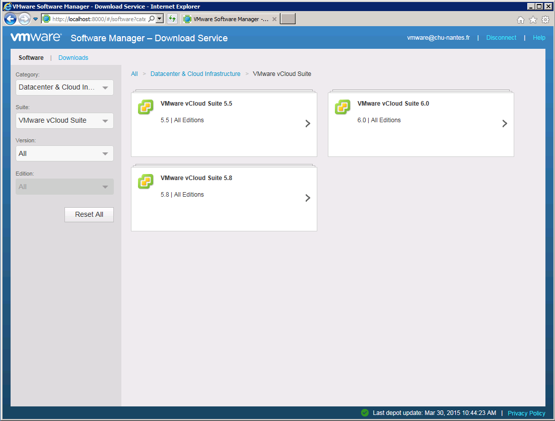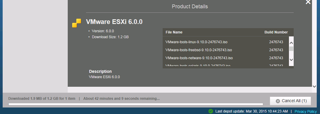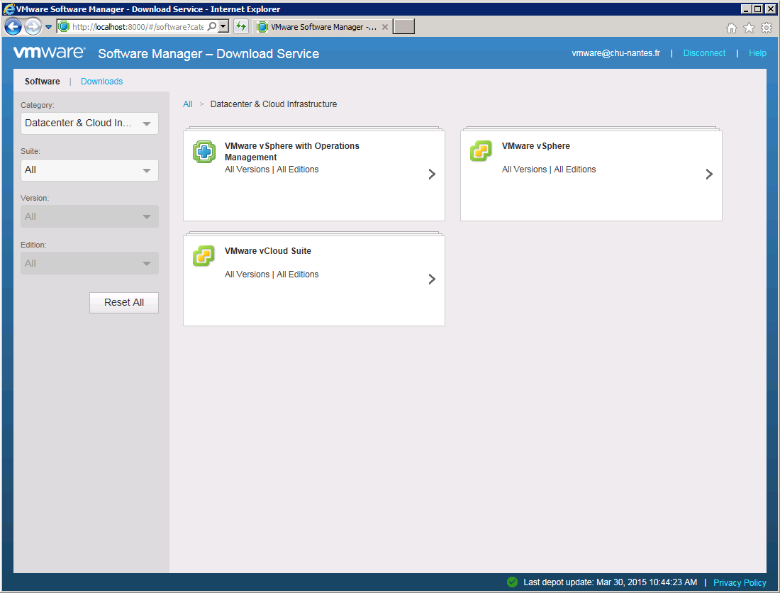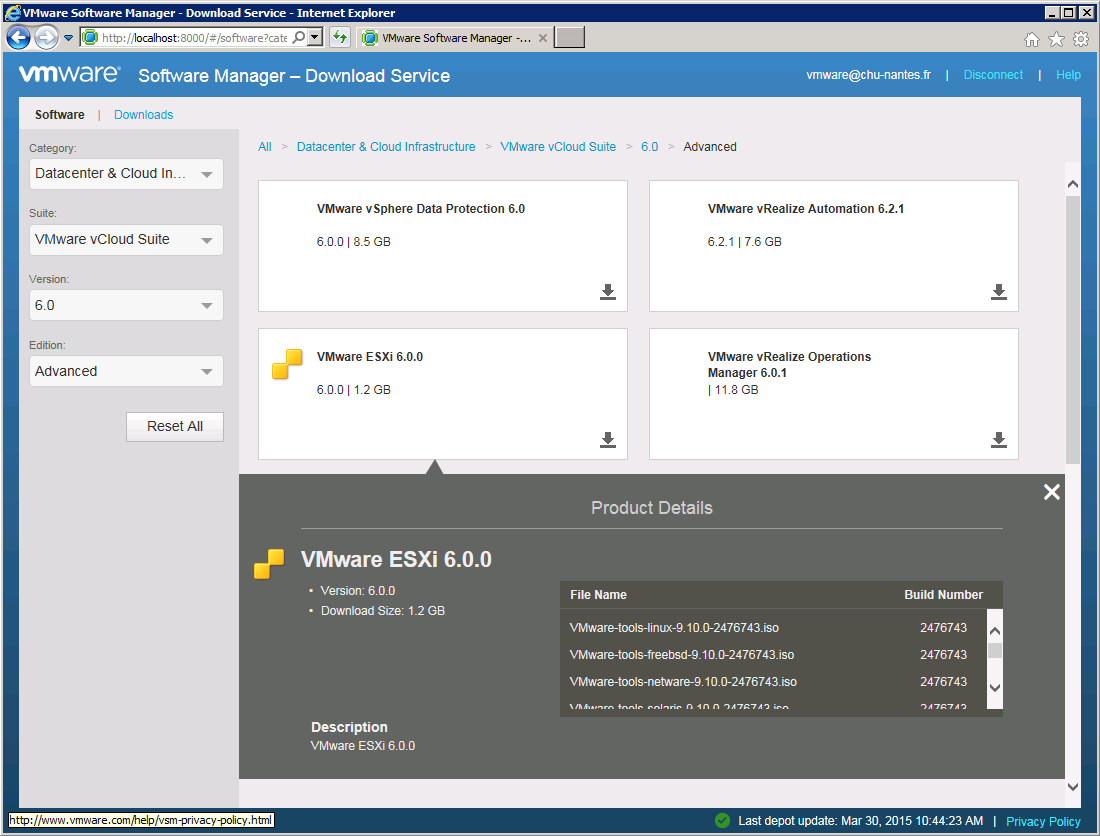 Il s’agit d’un petit logiciel (16 Mo) à installer sur une machine Windows qui vous donne accès rapidement et via une interface web « locale » aux distributions VMWare disponibles, en fonction des licences dont vous disposez, sur le site MyVMWare. L’interface web en question vous présente ces distributions de manière hiérarchique et télécharge pour vous les packages, iso, tarball correspondantes. Ces téléchargements sont stockés à un endroit défini lors de l’installation, également sous forme de hiérarchie de répertoires, simplifiant du même coup leur gestion.