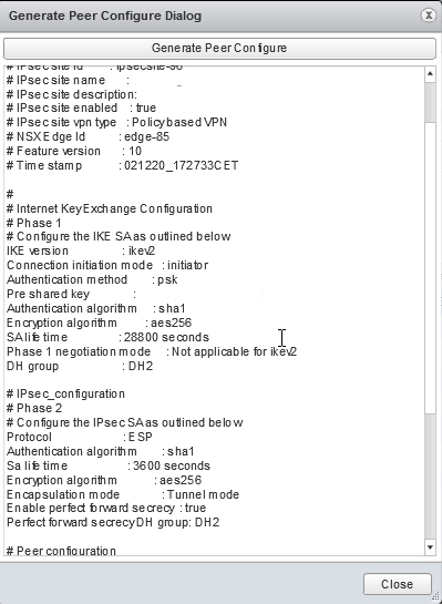Sous vSphere, dans la section « Network and Security » (NSX-V, donc), nous avons accès à quelques paramètres de la Edge NSX-V via l’interface en Flash, mais pas la totalité malheureusement. Il fallait donc utiliser la granularité de configuration supérieure coté Checkpoint pour arriver à faire coïncider les spécifications de la phase 2 sur chaque pair.