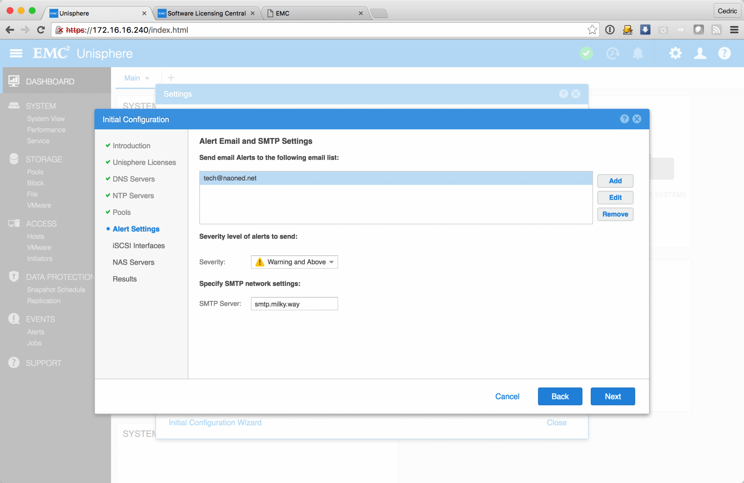 La dernière partie de l’assistant vous propose de tout de suite configurer les pools, serveurs NAS, interfaces iSCSI etc. J’ai passé toute cette partie pour au moins terminer la configuration initiale avant de m’aventurer plus avant dans les sections ad-hoc. J’ai juste renseigné les infos de notification d’événements/alertes.