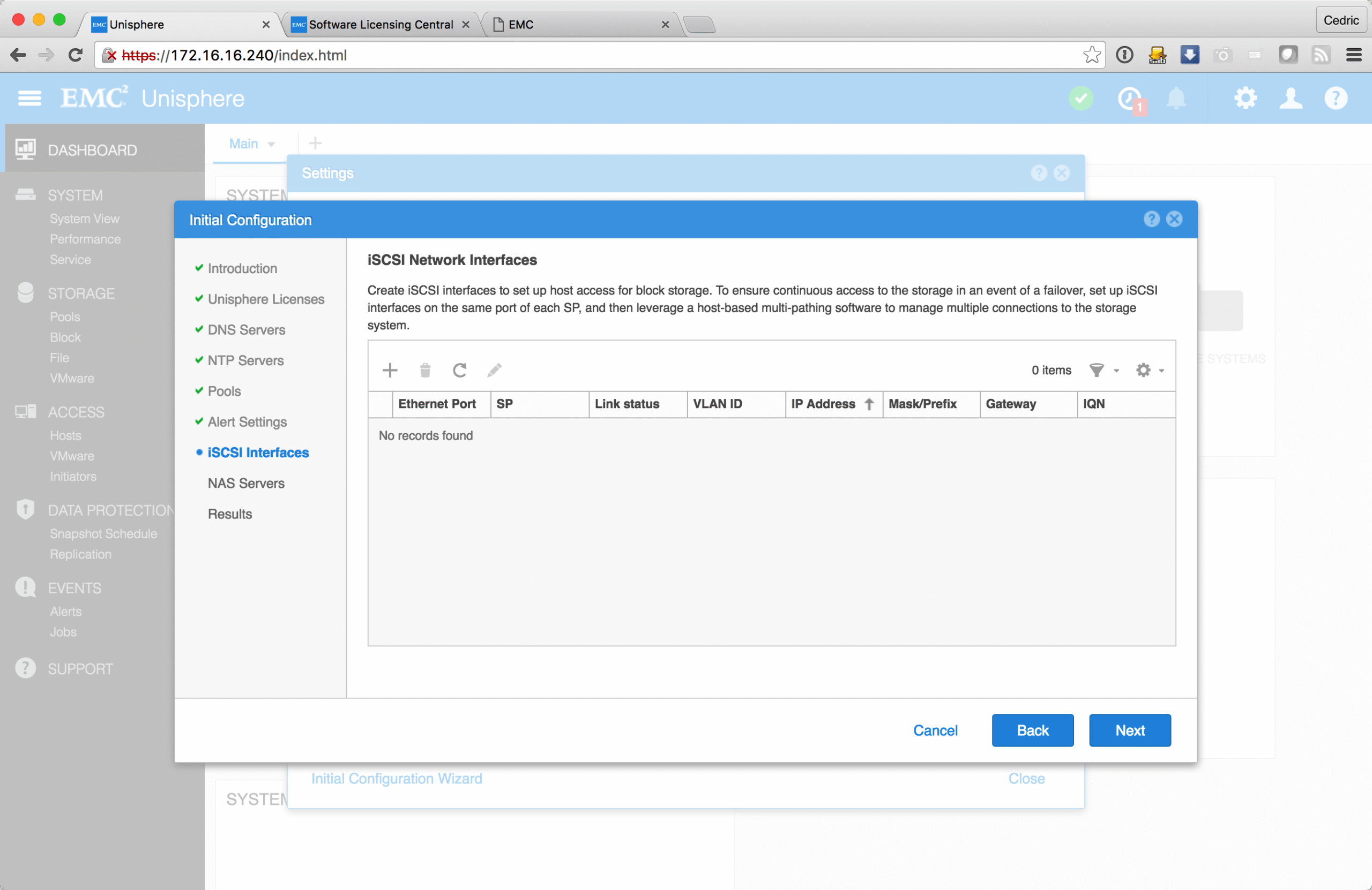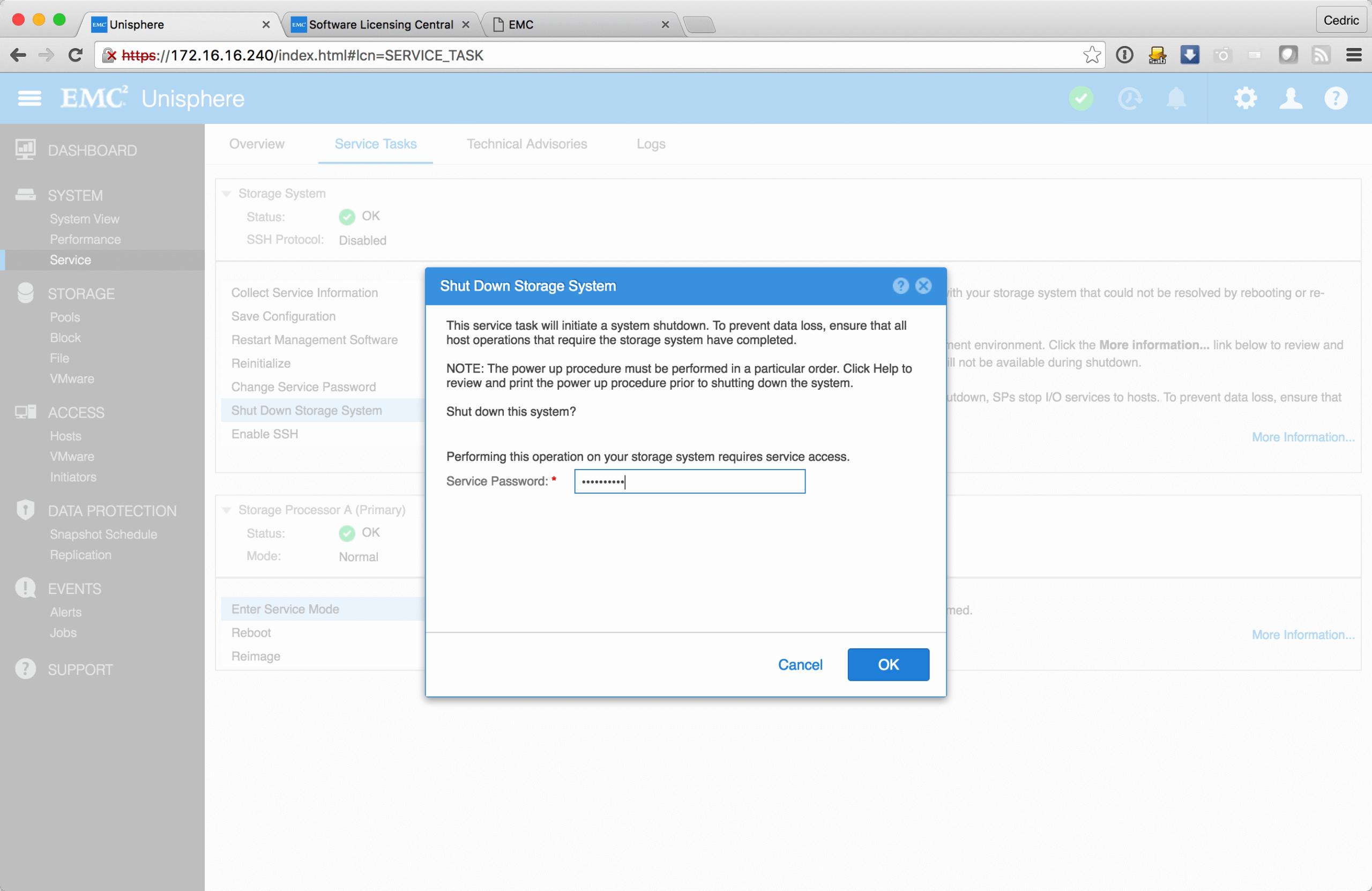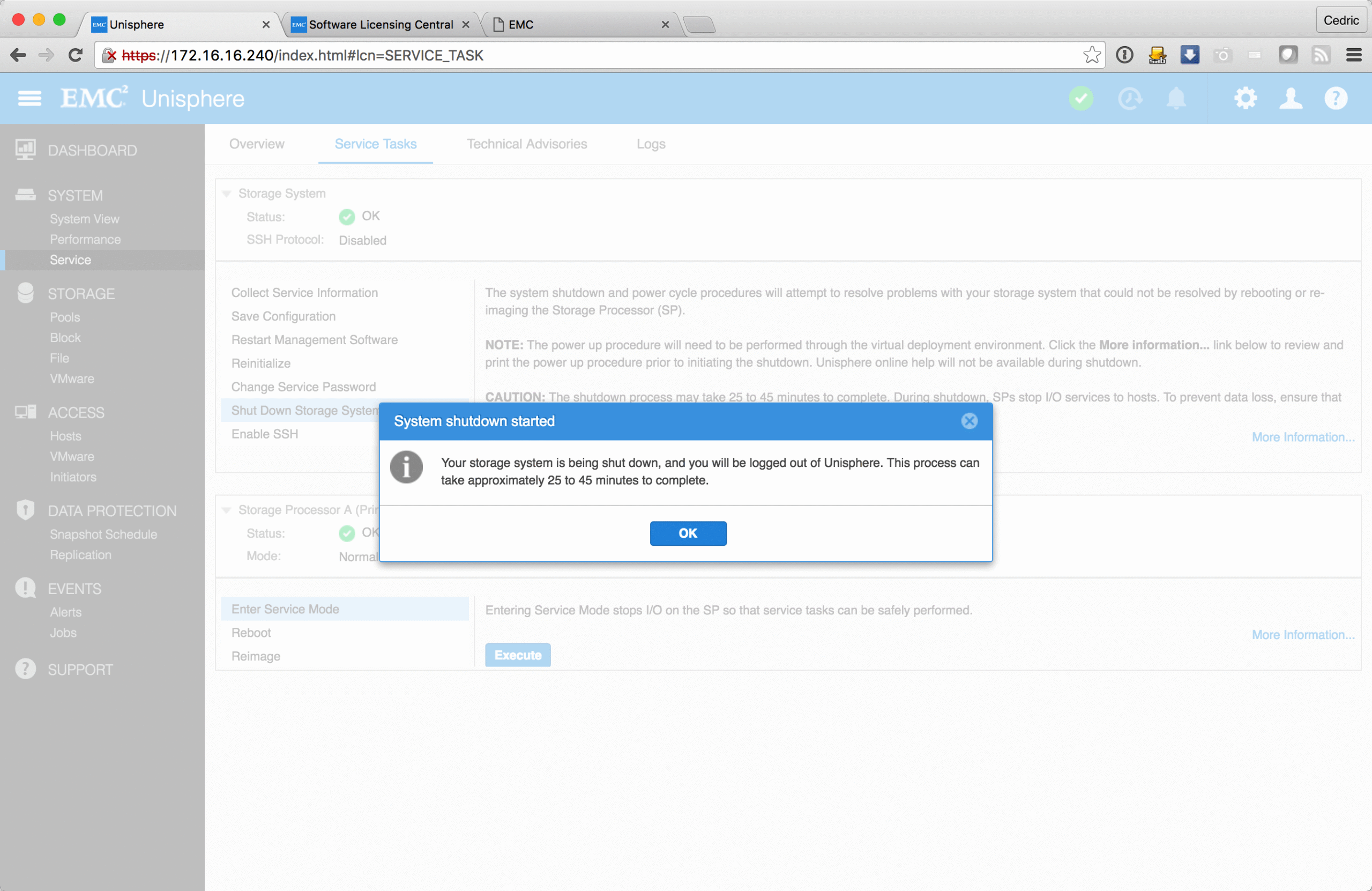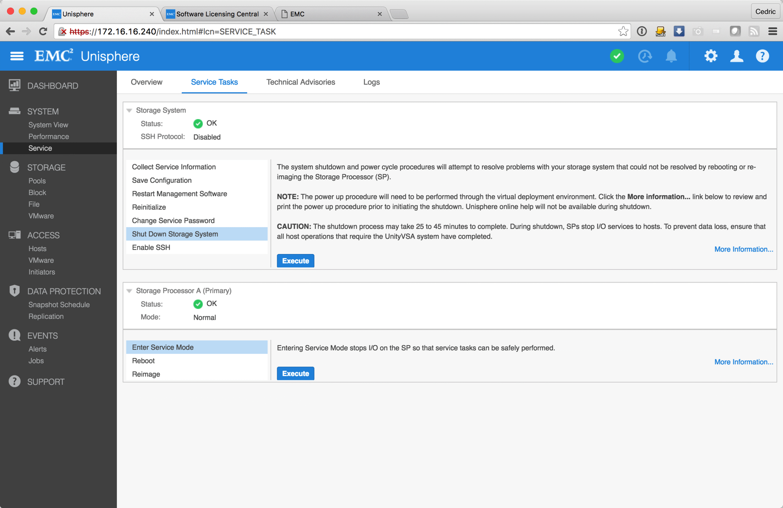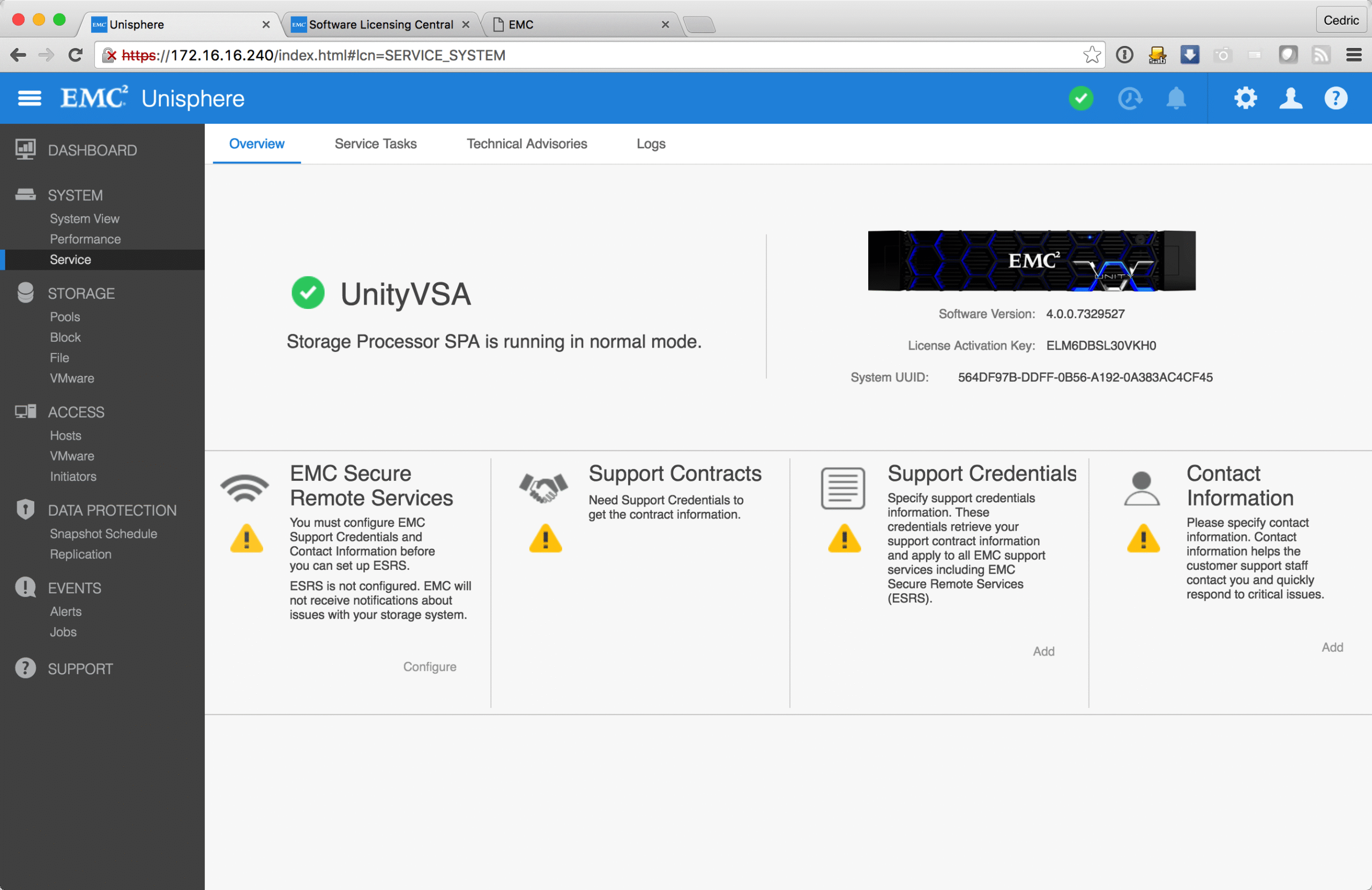 J’ai un véritable soucis avec le Unity VSA; quand je démarre la baie elle va en mode service. Les onglets sont inactifs lorsque je me connecte.