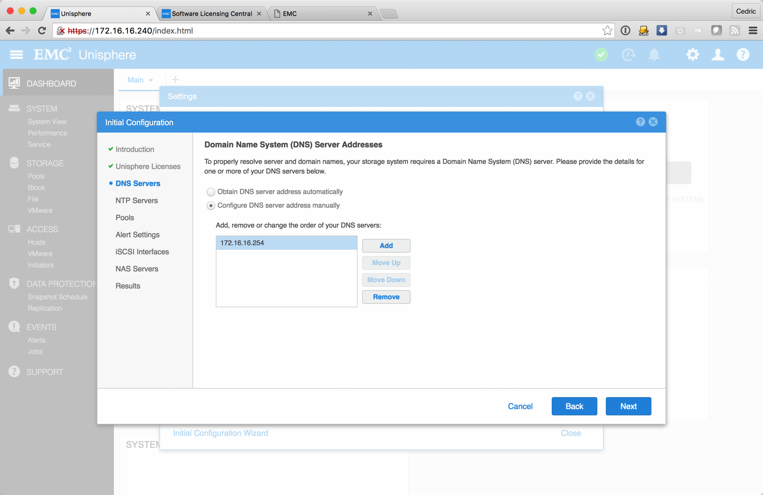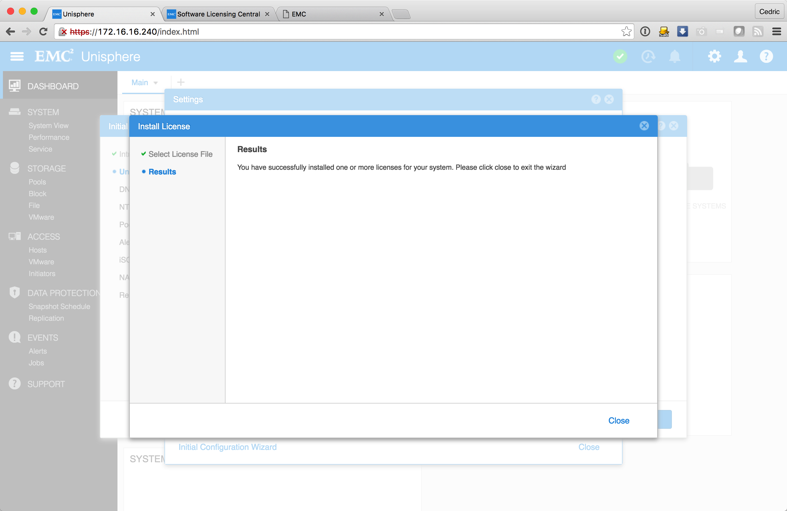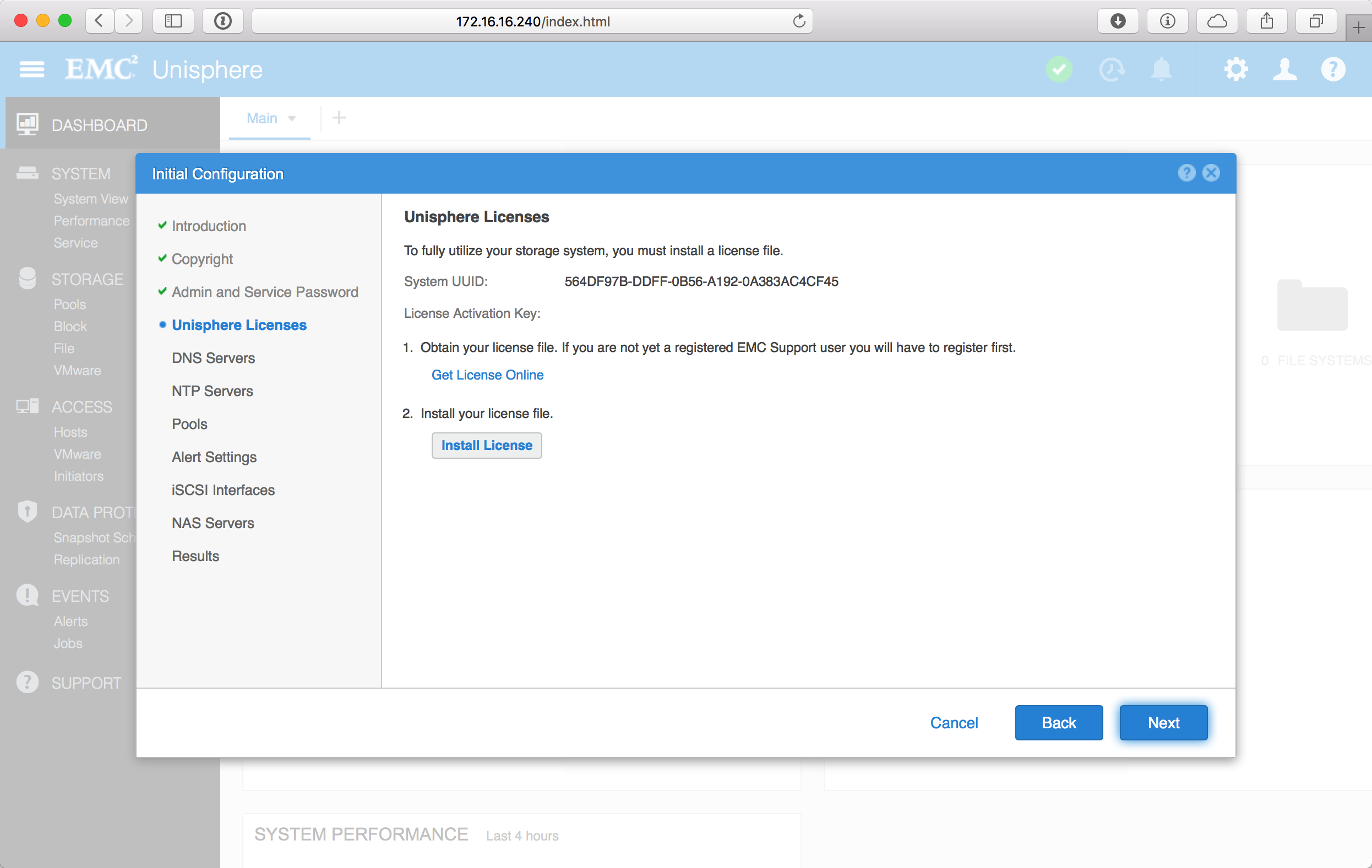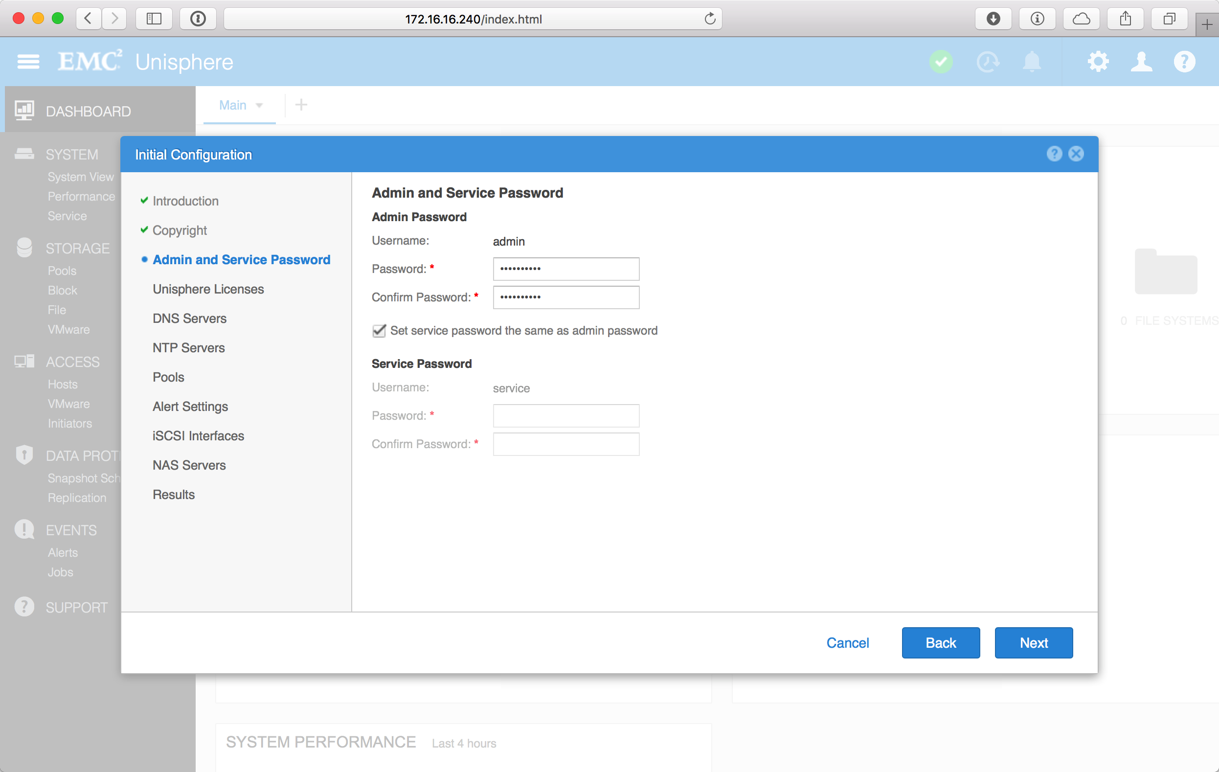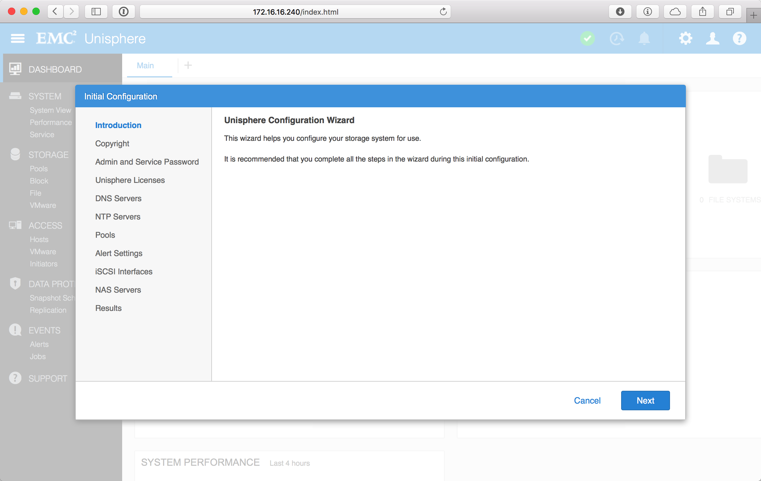 J’ai un véritable soucis avec le Unity VSA; quand je démarre la baie elle va en mode service. Les onglets sont inactifs lorsque je me connecte.