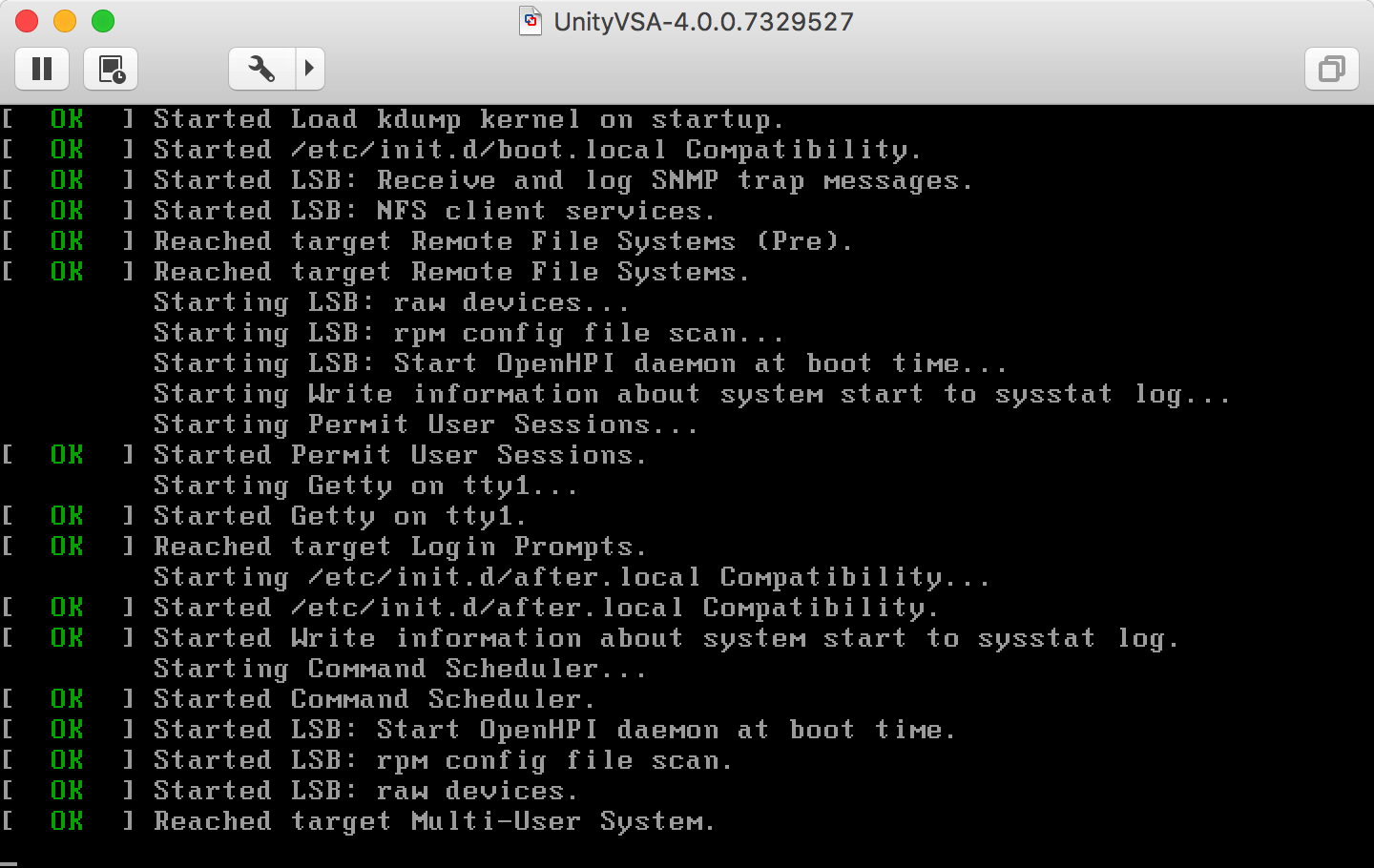 L’installation initiale est triviale ou presque, on upload l’OVA et on démarre. Par défaut, lors du premier boot, la machine virtuelle va passer quelques minutes à instancier le conteneur chargé d’assurer les fonctions Storage Processor. Parce que, oui, comme indiqué dans la présentation, Unity est vraiment basé sur la notion de conteneurs isolés chargés chacun de tâches bien distinctes. On le voit bien au boot de la machine : c’est une distribution ESXi qui démarre la première ; ensuite, elle lance un certain nombre d’instances spécifiques, sans doute sous la forme de micro-VMs (voire de vrais conteneurs au sens Docker du terme, mais c’est difficile à confirmer en ne regardant que la console, évidemment).
