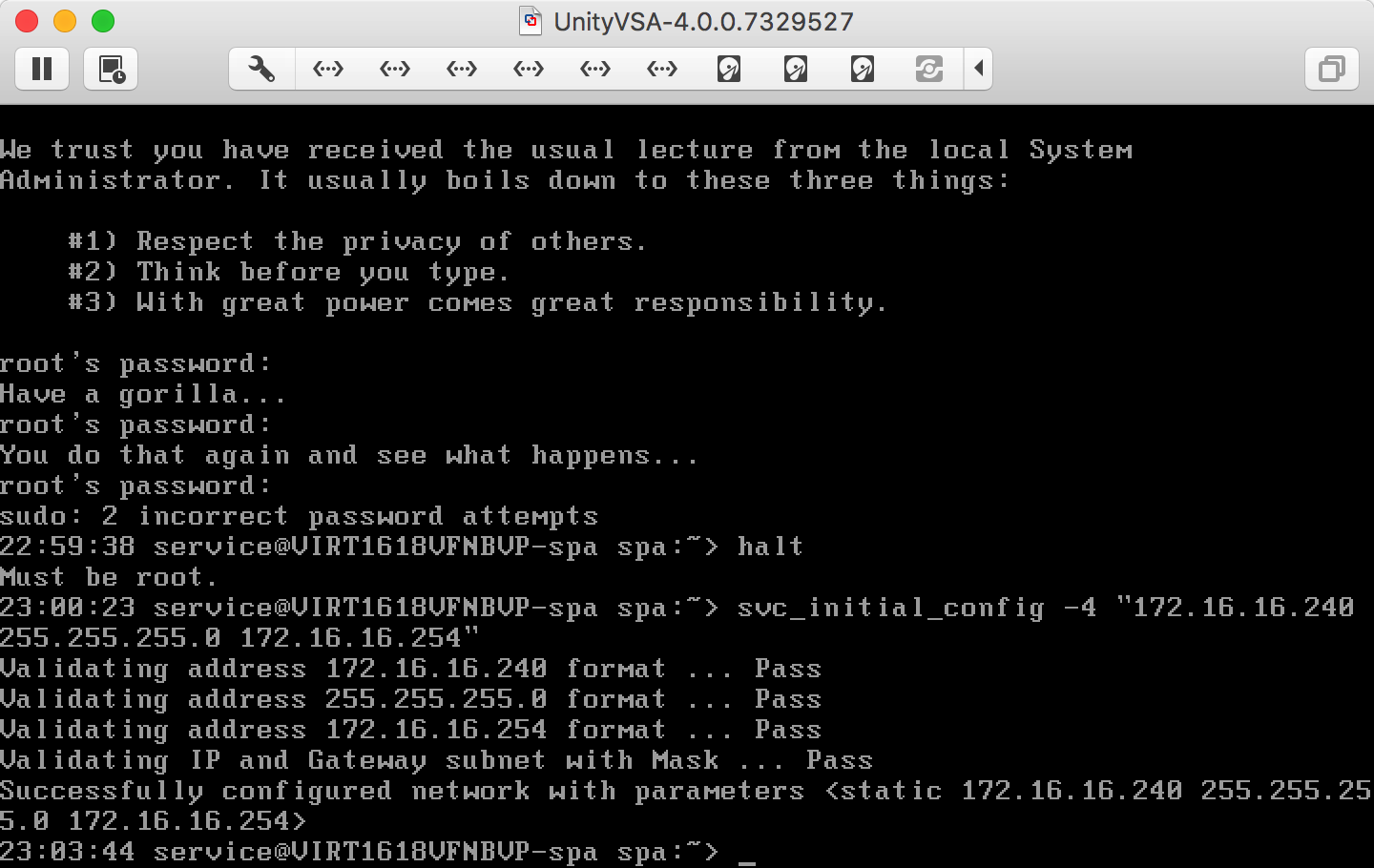 Une fois cela réalisé, si vous avez connecté sa première carte réseau sur un VLAN disposant d’un DHCP, normalement, la VSA va l’utiliser et s’attribuer une IP disponible. De mon coté, j’ai eu des petits soucis avec ça, donc je suis passé en mode manuel en utilisant la méthode indiquée dans le manuel d’installation. Il faut se connecter sous le compte service/service et utiliser la commande