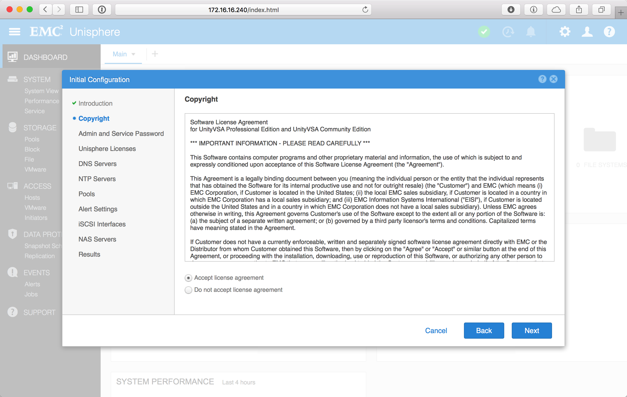Comme quasiment toutes les distributions logicielles d’EMC maintenant, Unity VSA est disponible sous forme d’OVA à installer très simplement sur un ESXi ou un hyperviseur desktop. L’utilisation de VSA impose un minimum de 12 Go de RAM et 2 vCPU. D’autre part, la machine elle-même est bridée à « 4 To » de disque adressable pour la version community. Rendez-vous ici pour obtenir l’OVA et télécharger les documentations associées.