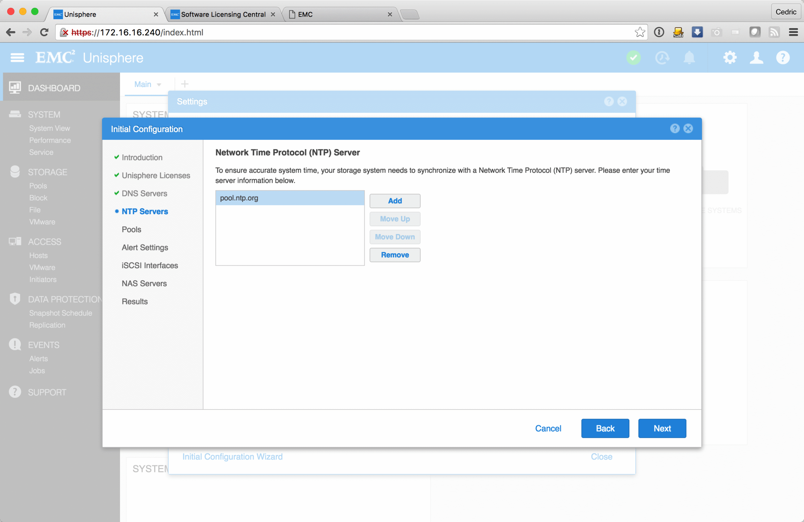 Après la partie licence et DNS, normalement, vous devez rentrer la liste des serveurs de temps. J’ai rencontré un petit souci à ce niveau là. En effet, le wizard m’interdisait de valider le serveur renseigné en précisant que cette modification imposait un reboot, par ailleurs interdit durant la phase de configuration. En gros, histoire de simplifier la procédure, ne renseignez pas les serveurs ntp lors de la première phase, attendez de premier reboot et retournez ensuite dans les paramètres pour l’ajouter 🙂