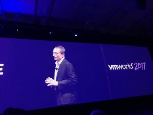 Jean-Pierre Brulard, grand patron de VMware EMEA, avec son accent légendaire ^^, évoque en premier lieu les attentats qui ont frappés Barcelone récemment par un « We are all Barcelona » de rigueur et de bon aloi. Il enchaine sur « We are all VMware », facile …