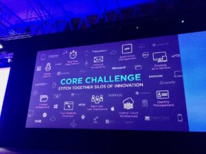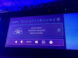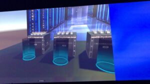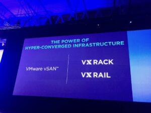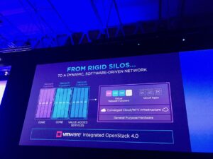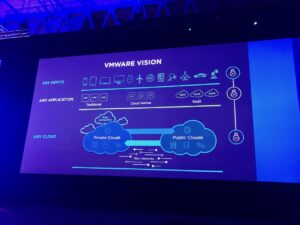 Pat Gelsinger, le CEO de VMware entre ensuite en scène et commence par une sorte de « back to the future », un retour aux sources et un résumé des progrès accomplis par l’IT depuis 15 ans. Au passage, nous auront droit au visionnage d’une des publicités de VMware datant du début des années 2000, très drôle, qui montre à quel point le discours à changé (j’ai posté un petit extrait en vidéo sur mon fil twitter, pour les curieux). Désormais, l’IT fait partie intégrante du « business » et est une composante essentielle de toute entreprise, l’IT est « sorti de son cocon » pour devenir aussi évidente que le département RH our la direction financière. Plus encore, la vision de VMware est clairement d’accompagner les entreprises à se mettre en conformité avec une production hybride On-premise/Cloud : c’est LE message à retenir de cette édition.