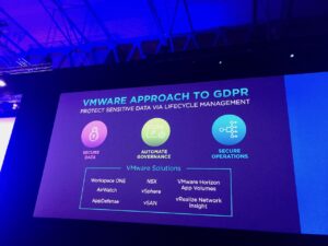 Pat va aussi insister sur l’impérieuse nécessité de sécuriser et consolider les connexions entre applications et utilisateurs et proposer NSX comme brique « network » universelle répondant à tous les enjeux et critères associés. Il en profite pour re-présenter AppDefense et sa complémentarité avec NSX, justement (on en reparlera bientôt). Pat va également utiliser la GDPR comme argument complémentaire pour illustrer son propos, VMworld Europe oblige 😉
