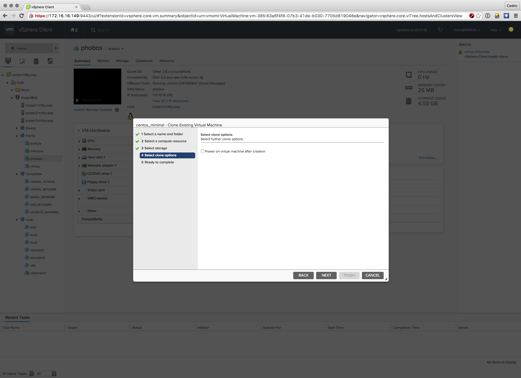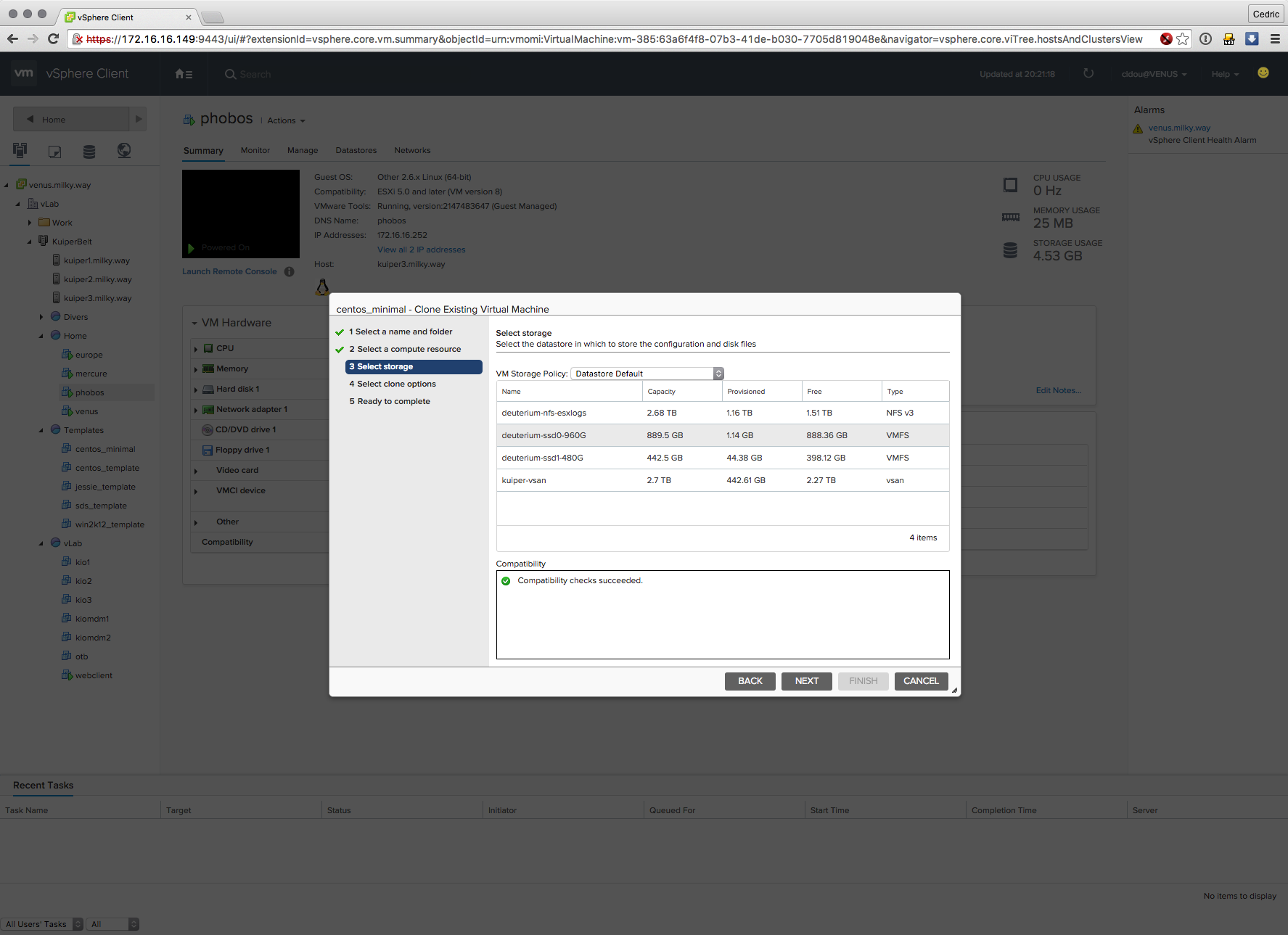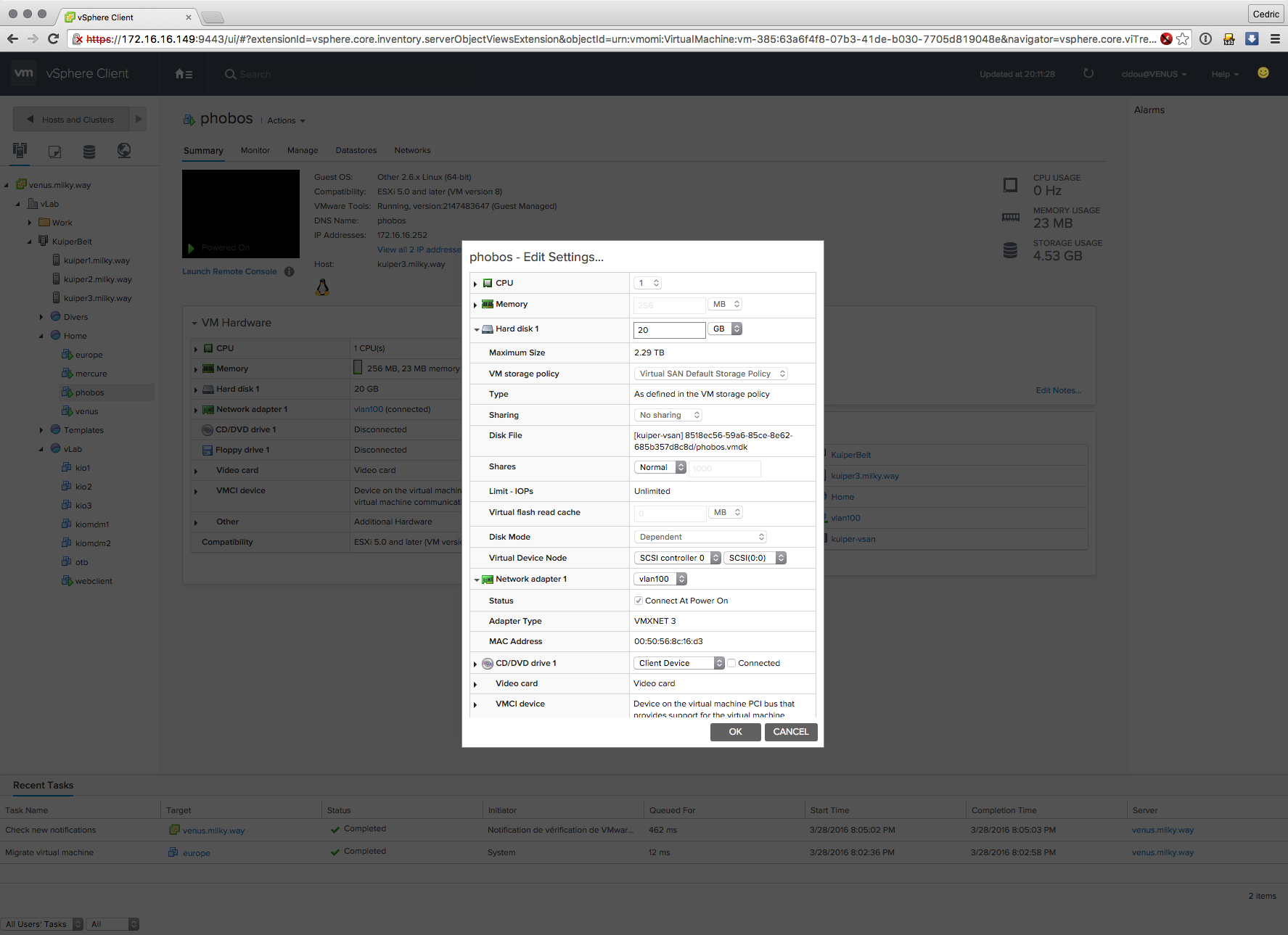 Je me rend compte en fait que je viens de mettre ma conclusion en introduction, mais comme il est tard, je vous la laisse comme ça 🙂 . Une fois n’est pas coutume, on va terminer par la pratique : l’installation et les belles images ! Comme déjà évoqué dans mon premier billet il y a quelques heures, le web Client HTML5 s’installe via le déploiement d’une OVA… donc simplissime. Sa configuration, par contre, est encore relativement artisanale. Il s’agit, comme indiqué dans la documentation, de préalablement lancer un fichier script au sein de la machine hébergeant votre vCenter 6. J’ai du bidouiller un peu le fichier batch Windows car celui-ci pointait en « dur » sur le C:, or mon installation de vCenter est sur un lecteur D: . Une fois le fichier modifié en conséquence, son lancement génère trois fichiers spécifiques store.ks, webclient.properties et ds.properties, qui vont servir au web client pour s’intégrer au SSO pour l’authentification et au vCenter pour le reste. Ces fichiers doivent ensuite être transférés via SSH sur l’OVA (une base Suse Linux ES 12) dans des répertoires ad-hoc. Je vous laisse découvrir tout cela dans la documentation au format PDF, simple et efficace.