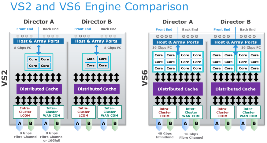 Ce refresh était déjà dans l’air depuis quelques mois (mes premières infos sous NDA datent du début de l’année) et elle est bienvenue… et bonne nouvelle : Les anciens clients VS2 seront éligibles, au besoin, à une upgrade non disruptive ! On a pas encore de détail sur la procédure mais nul doute que ce sera malgré tout une opération lourde (surtout sachant que les LCOM passent du FC à l’infiniband).