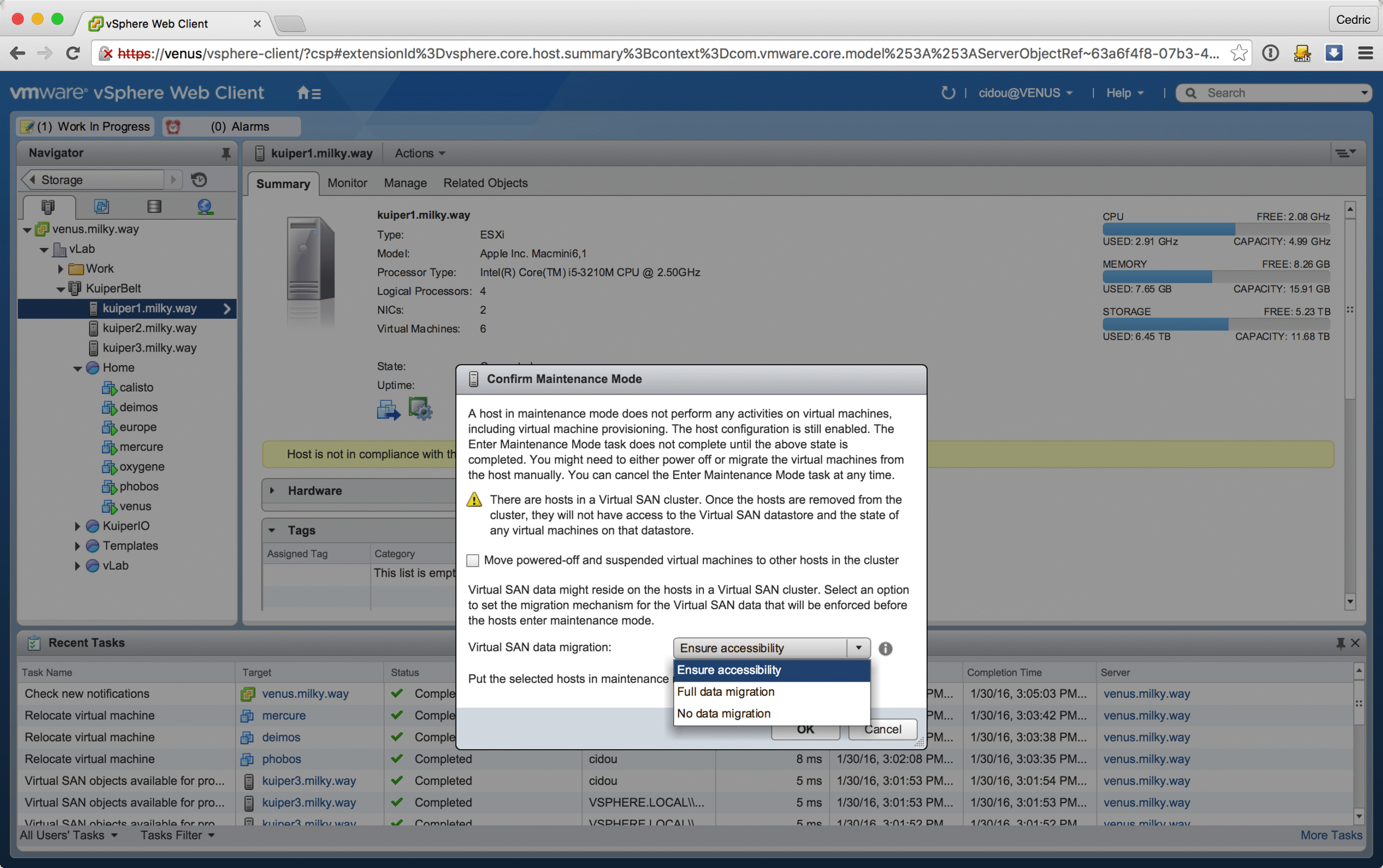 – maintenir l’accessibilité des VM : VSAN va vérifier que toutes les données présentent sur la machine sont bien également présentes sur d’autres serveurs du cluster. Si ce n’est pas le cas, une copie sera réalisée avant la mise en maintenance