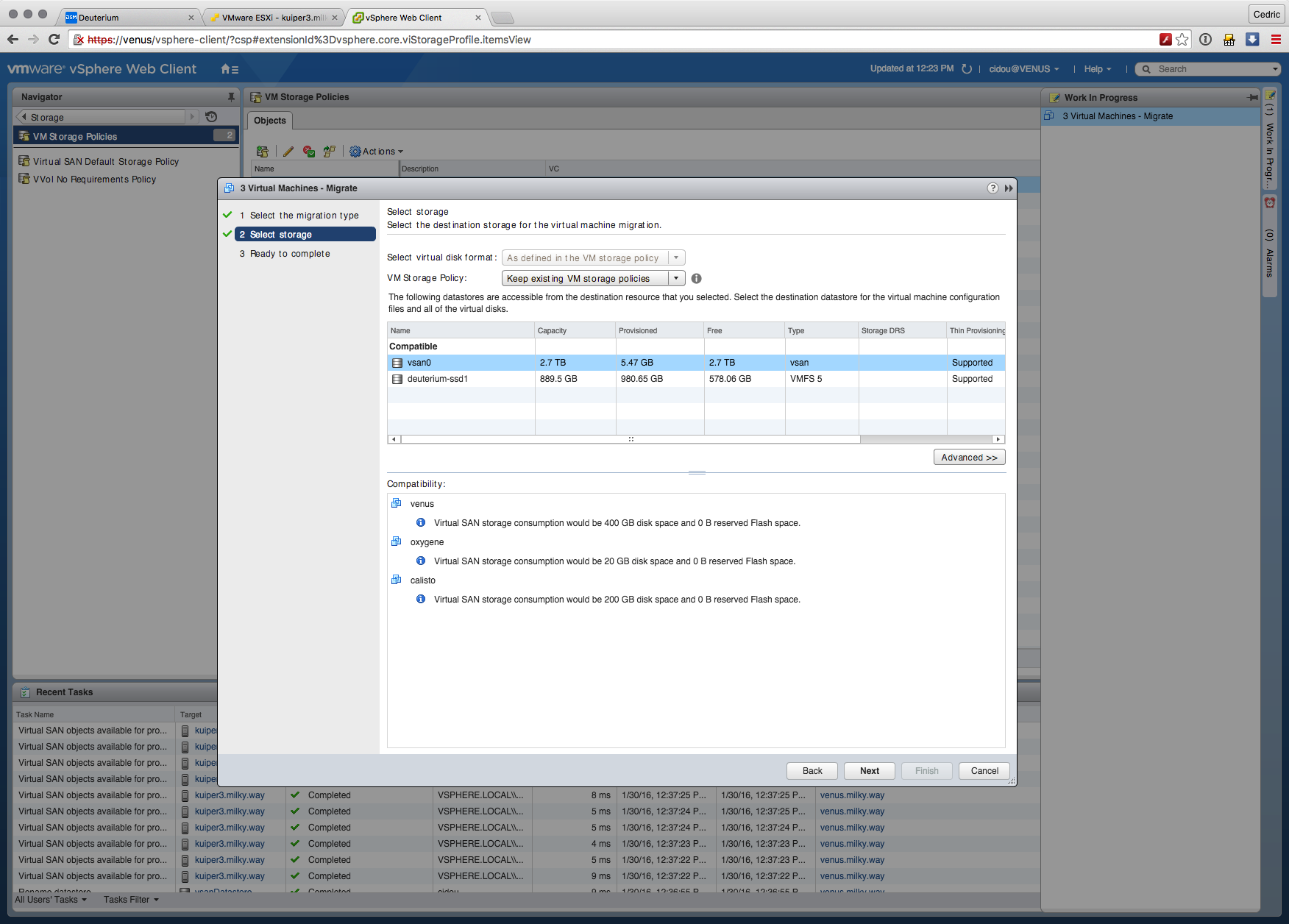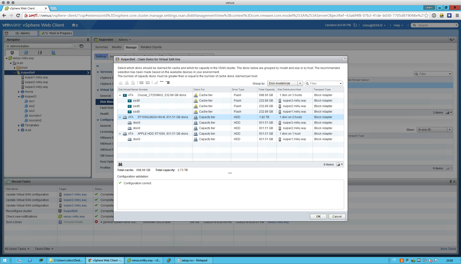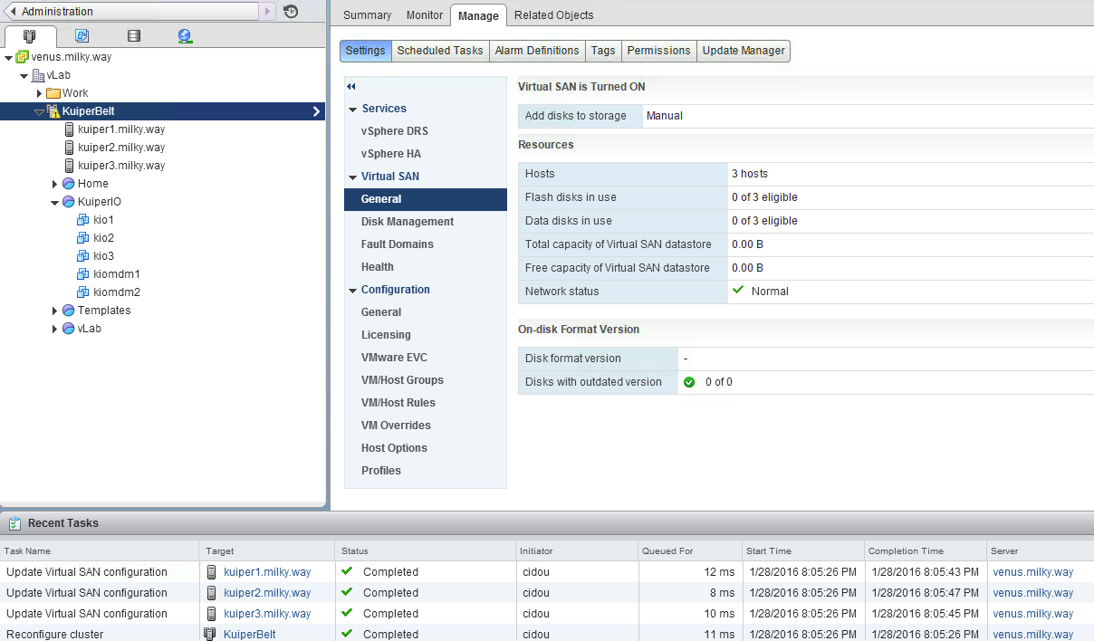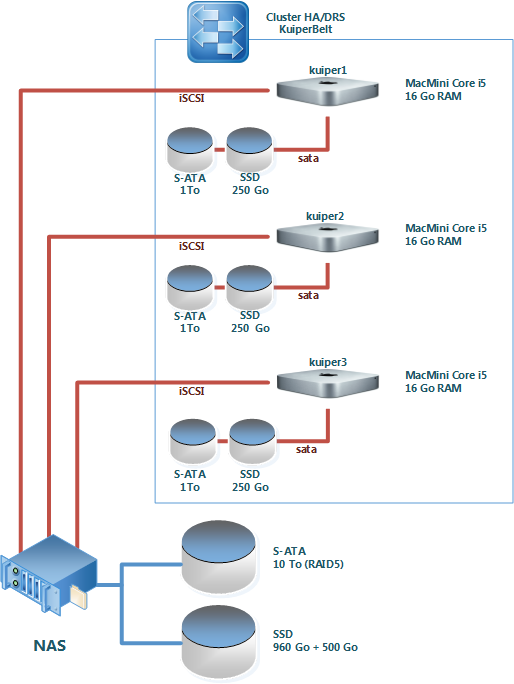 Pour se faire, il a fallut que je mette à jour mon petit vLab personnel. Rappelez-vous, à l’époque, je vous avais présenté ma modeste configuration pour commencer à travailler chez moi et disposer du minimum pour avoir un vCenter et quelques Go RAM pour héberger des VM (en plus des petites machines personnelles). Depuis, le vLab a pas mal évolué et est désormais constitué de 3 Mac Mini chacun pourvu de 16 Go de RAM et surtout d’un couple identique de disques : un SSD de 256 Go et un disque classique d’1 To.