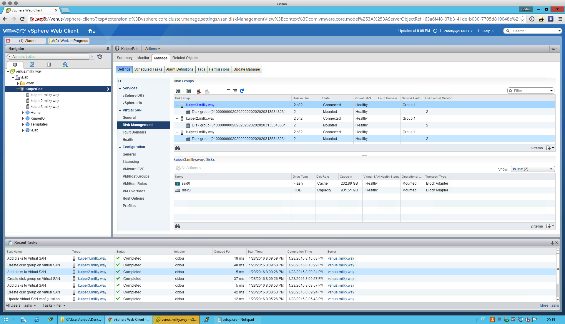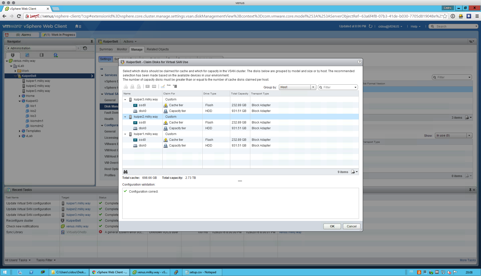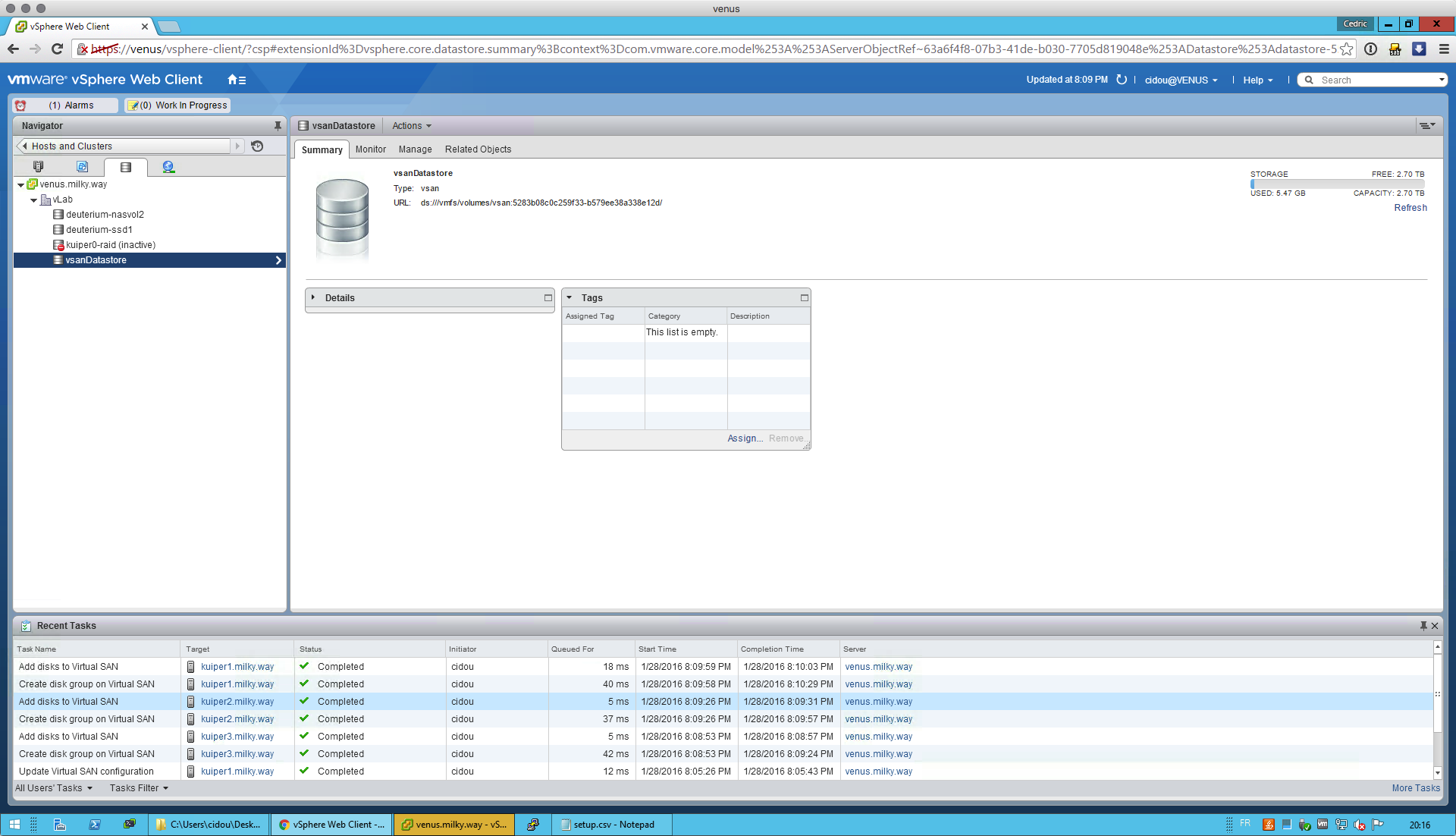 Pour se faire, il a fallut que je mette à jour mon petit vLab personnel. Rappelez-vous, à l’époque, je vous avais présenté ma modeste configuration pour commencer à travailler chez moi et disposer du minimum pour avoir un vCenter et quelques Go RAM pour héberger des VM (en plus des petites machines personnelles). Depuis, le vLab a pas mal évolué et est désormais constitué de 3 Mac Mini chacun pourvu de 16 Go de RAM et surtout d’un couple identique de disques : un SSD de 256 Go et un disque classique d’1 To.