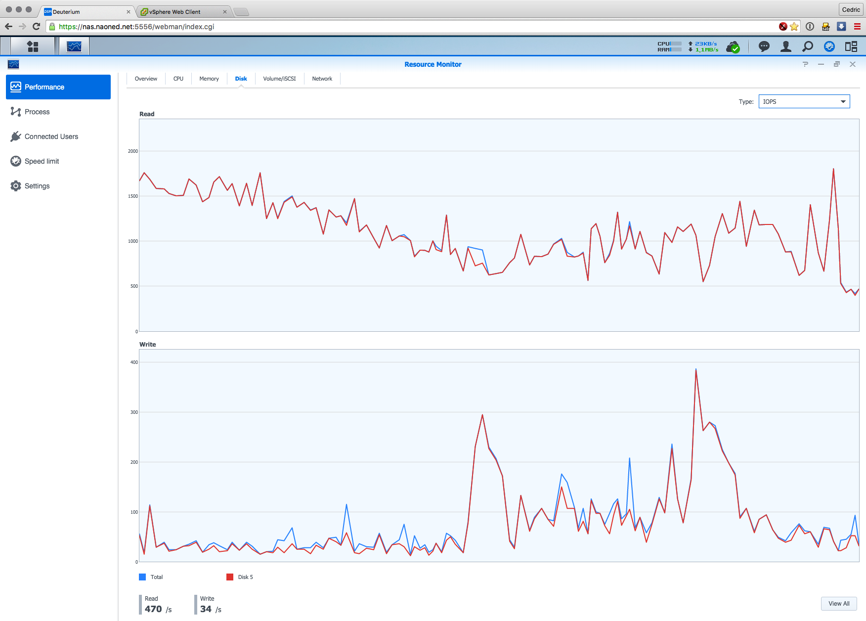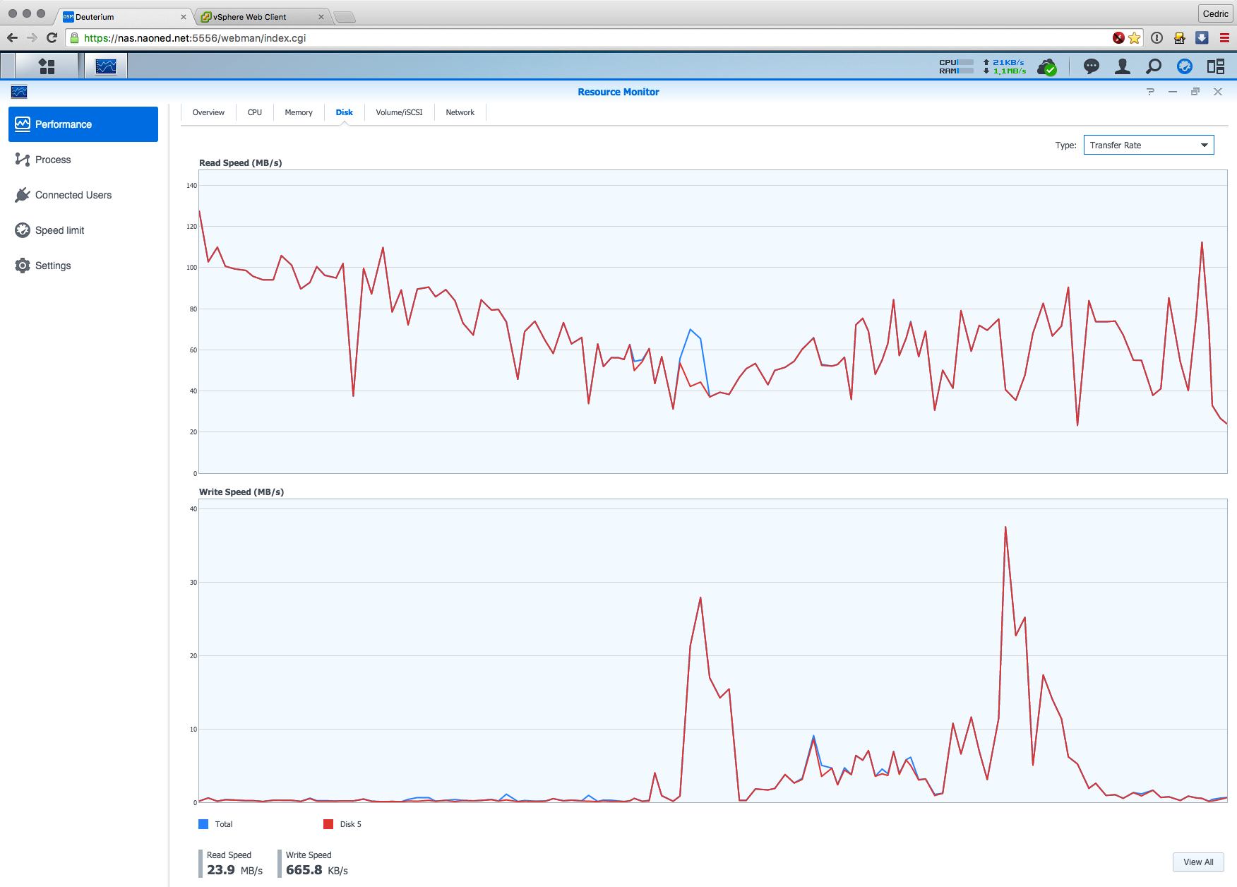 On remarque tout de même que les CPUs des machines (des Core i5 mobile double coeur) sont pas mal sollicités pendant cette opération (de 20 à plus de 40% à certains moments), mais ça parait logique étant donné que de nombreuses couches soft sont utilisées et que les CPUs sont loin d’être des bêtes de course.