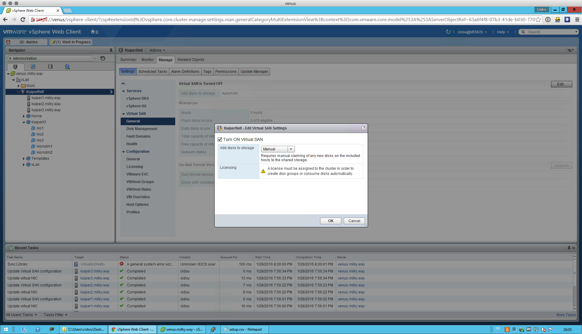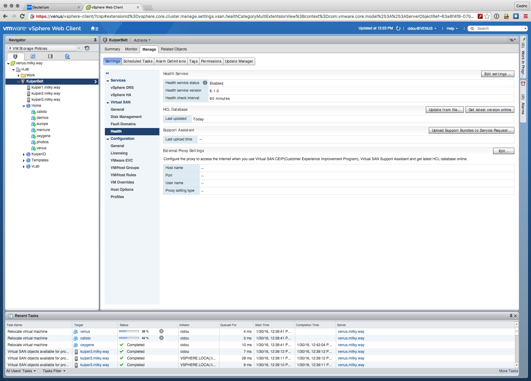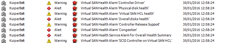 Après une demi-heure environ et en plein test de charge, j’ai eu une petite frayeur quand j’ai vu débarquer une dizaine d’alertes quasi simultanéement, dont certaines critiques sur la console… j’ai tout cassé ?! En fait non (mais ça m’arrive je vous rassure ^^). L’adrénaline est vite retombée quand j’ai constaté que ces alertes provenaient du module de contrôle de l’état de santé de VSAN. En effet, vCenter est capable d’aller chercher dans la HCL de VMWare pour vérifier si les composants utilisés pour VSAN sont bien référencés, ceci afin de prendre toutes les garanties quant au bon fonctionnement de la couche SDS. Evidemment, on imagine bien que les Mac Mini et de banals contrôleurs SATA intégrés ne sont sans doute pas supportés, d’où les alertes.