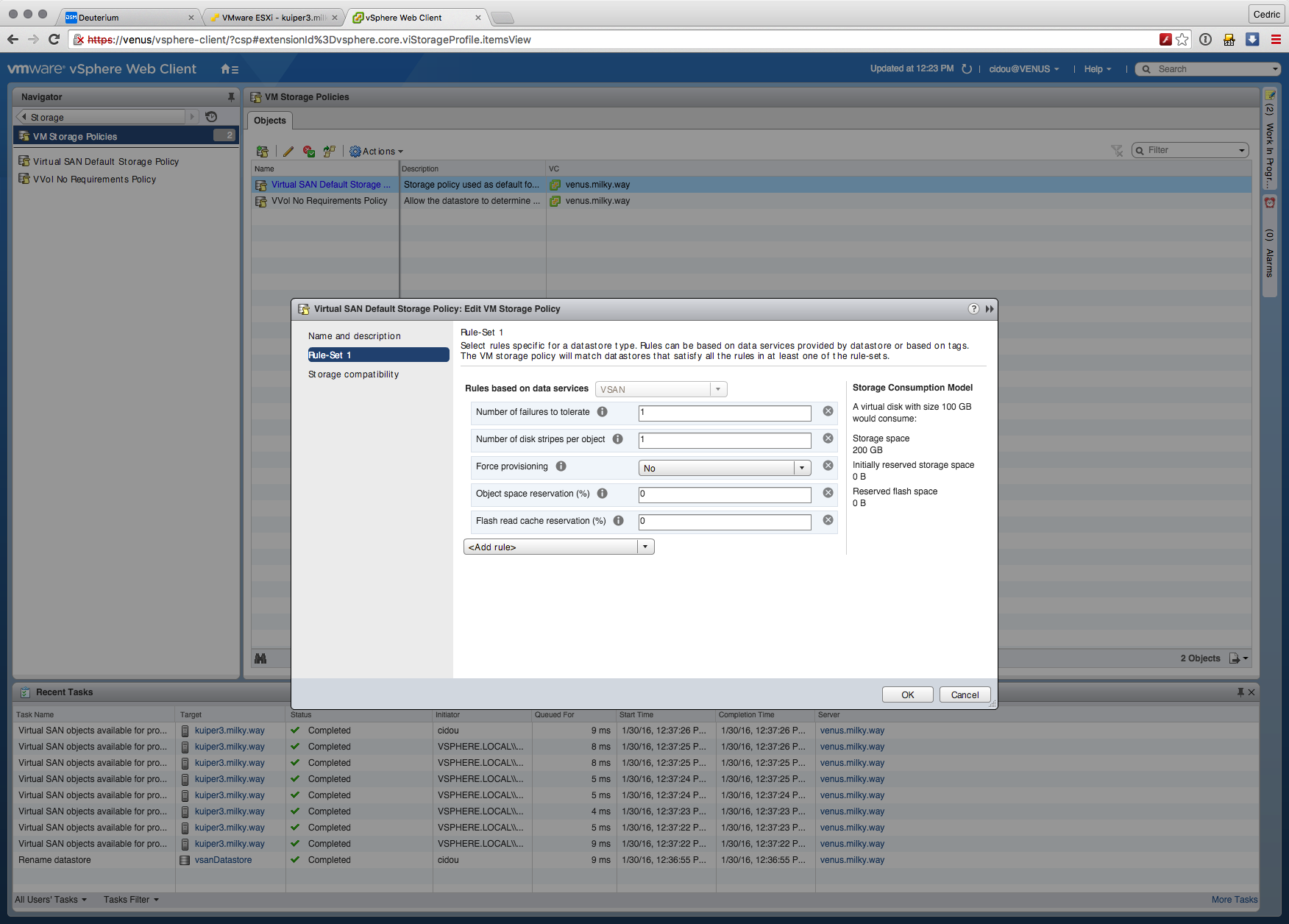 Par défaut lors de la création du cluster, vCenter créé une politique par défaut qui protège chaque machine déplacée ou créée sur VSAN contre la perte d’un élément matériel (un ESXi, isolation réseau d’un des serveurs, perte d’un disque etc. …). Avec celle-ci, chaque block de donnée est donc copié deux fois, sur deux diskgroups différents, donc deux ESXi différents.