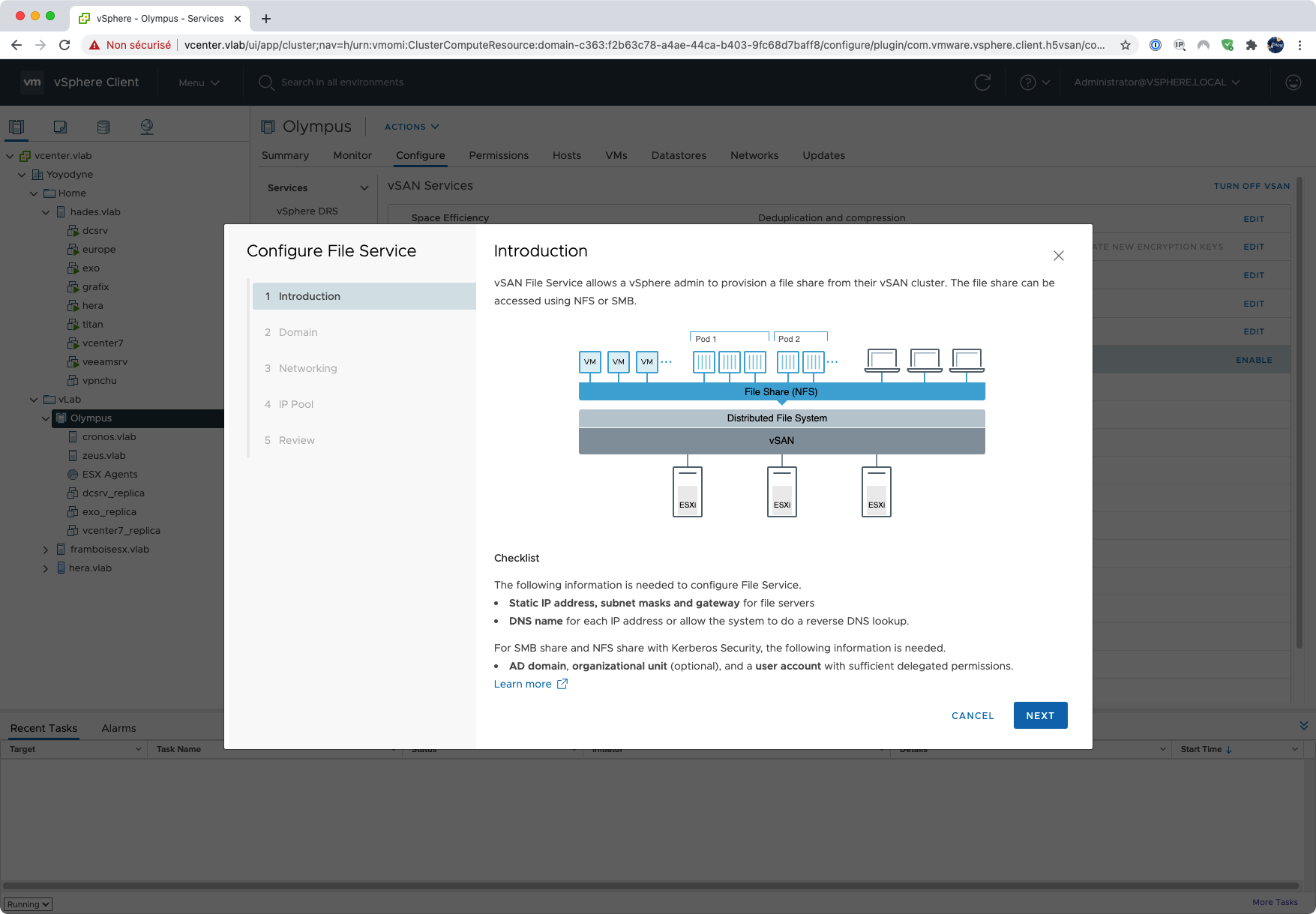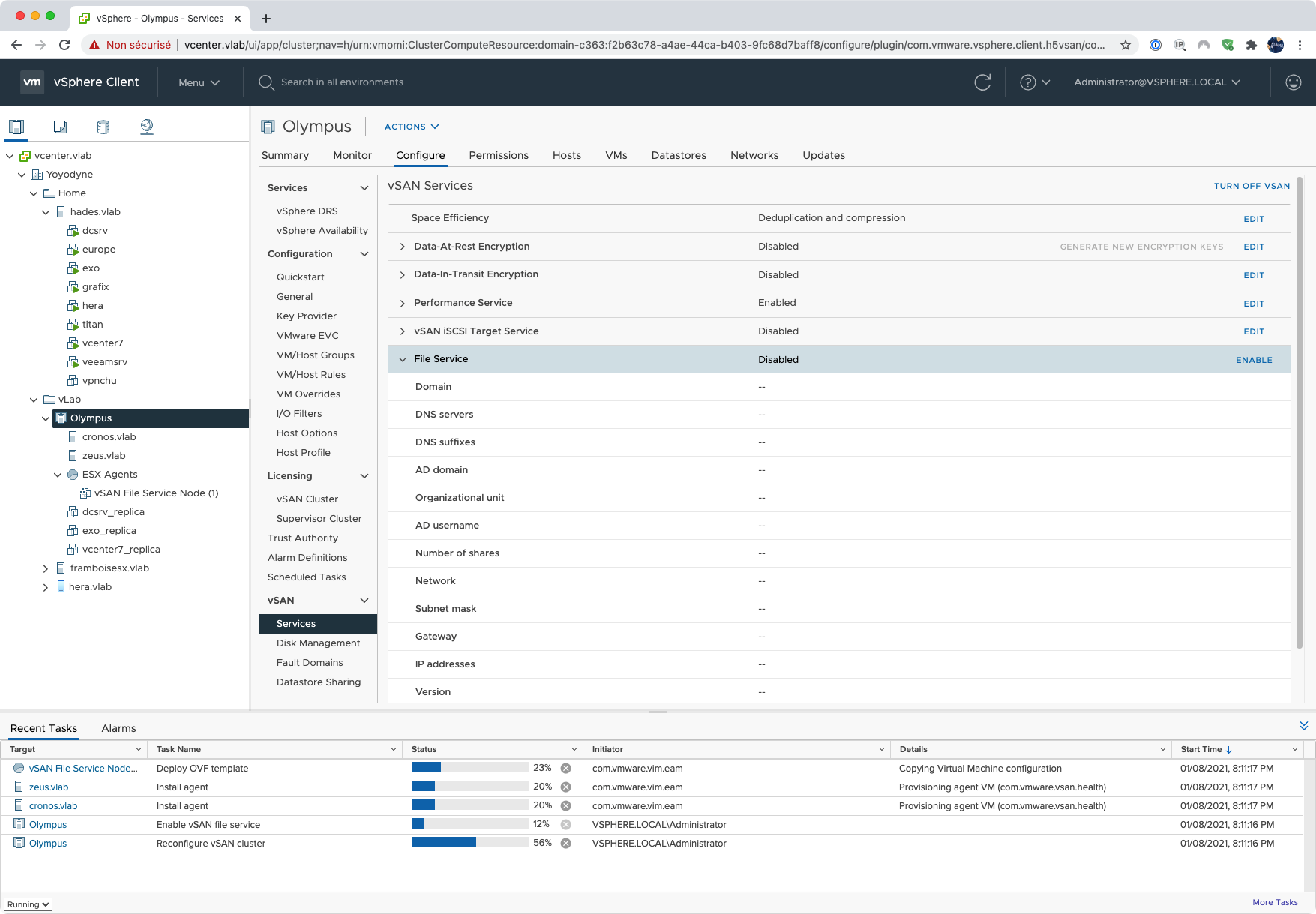 Sur VSAN7u1, l’activation de File Services se fait directement via la console vSphere, dans l’onglet Configuration/VSAN. Pour le coup, je vous illustre ça avec des copies d’écrans, dont je ne vous ai pas abreuvé récemment, donc ceux qui aiment ça seront comblés ^^.