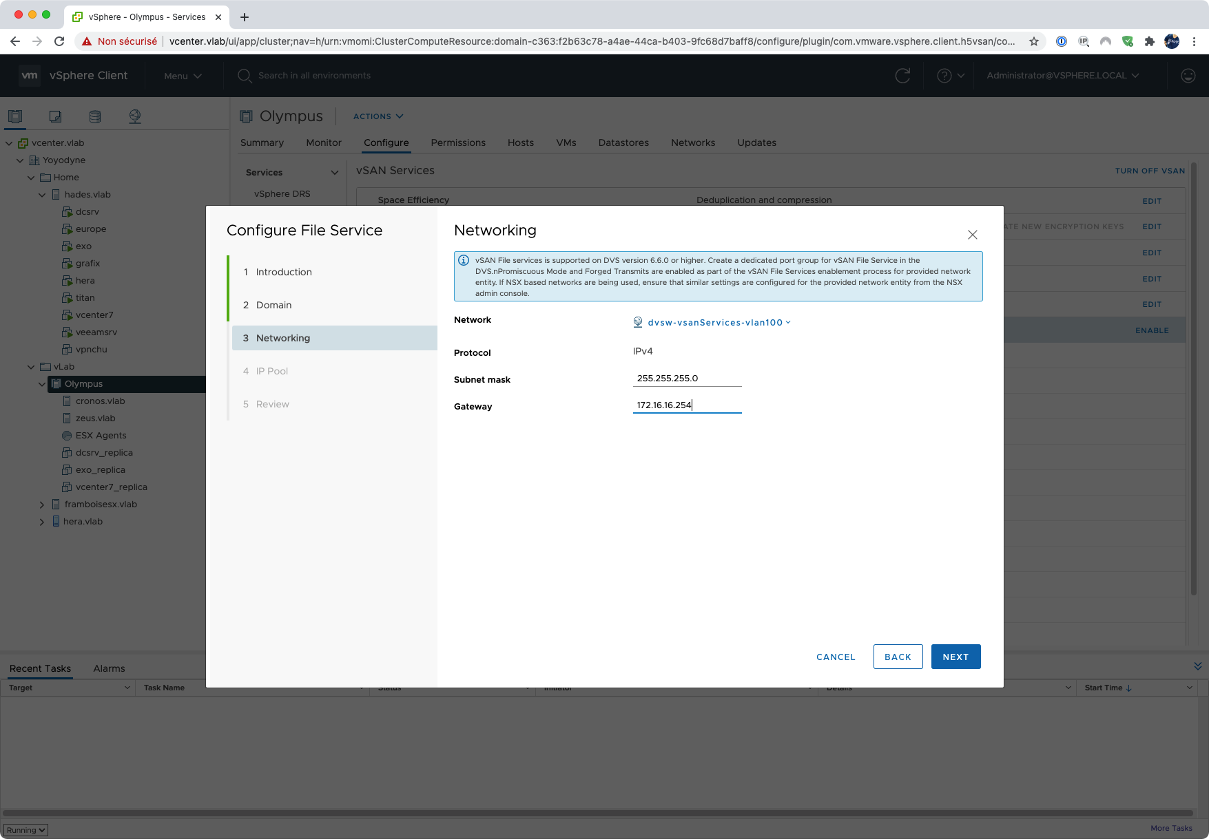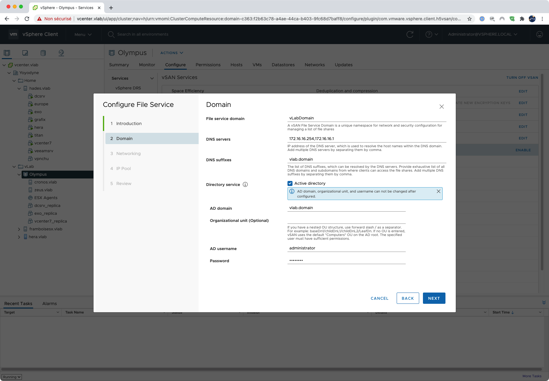 Les premières phases sont classiques, une petite introduction, on définit les paramètres réseau de base, enfin la connexion à votre instance Active Directory. En effet, chaque tête NAS File Services va s’enregistrer en tant que serveur dans le domaine associé, pour pouvoir ensuite partager la base de comptes et assurer le RBAC. Ensuite, on indique sur quel portGroup de votre dvs vous allez « cabler » ces VMs. VMware recommande de dédier un portgroup pour les file services car certaines fonctions spécifiques (mac-address learning et le mode promiscuous, notamment) sont utilisées pendant la configuration initiale. Vous pouvez consulter le billet de Duncan Epping sur ce sujet, ici.