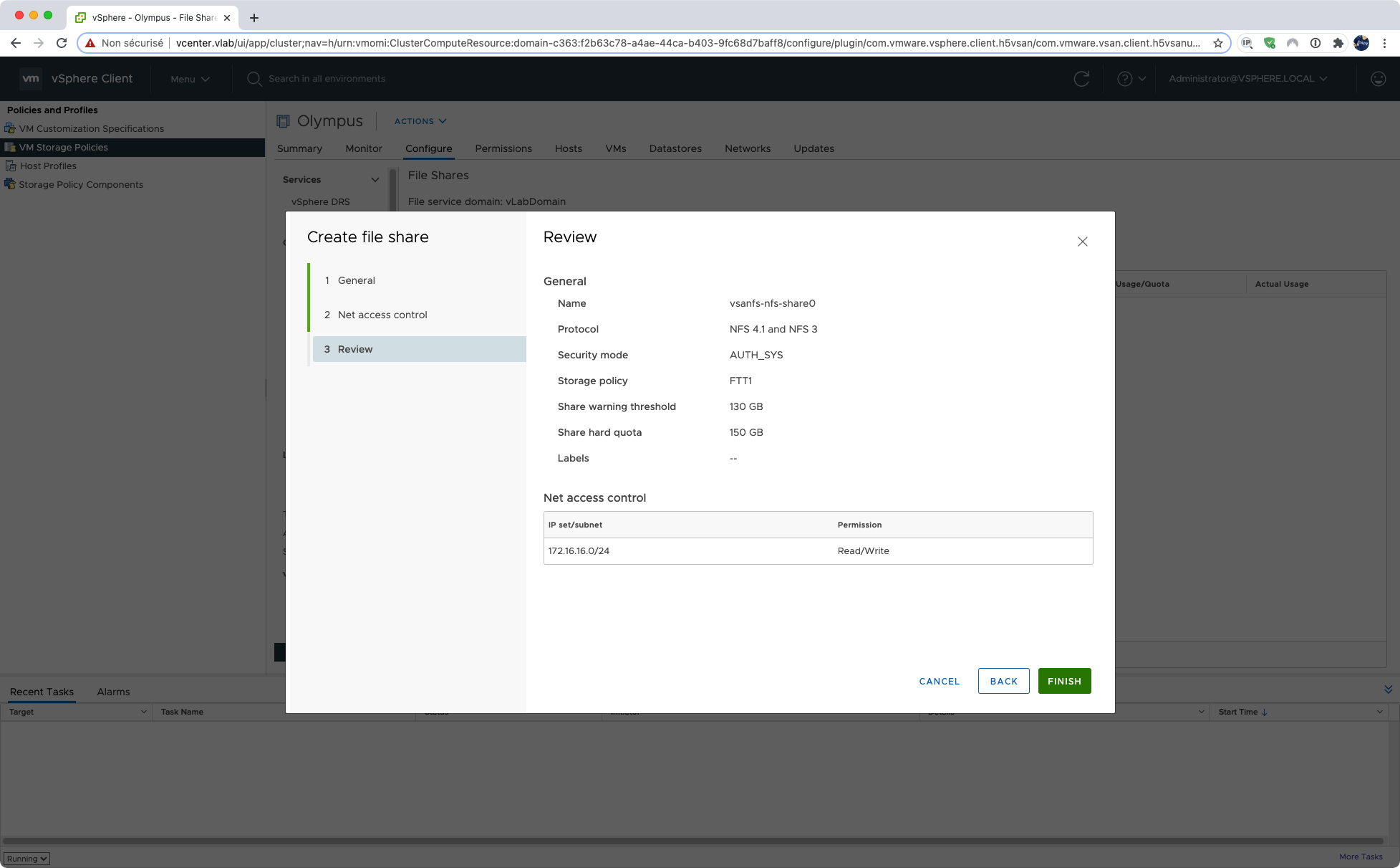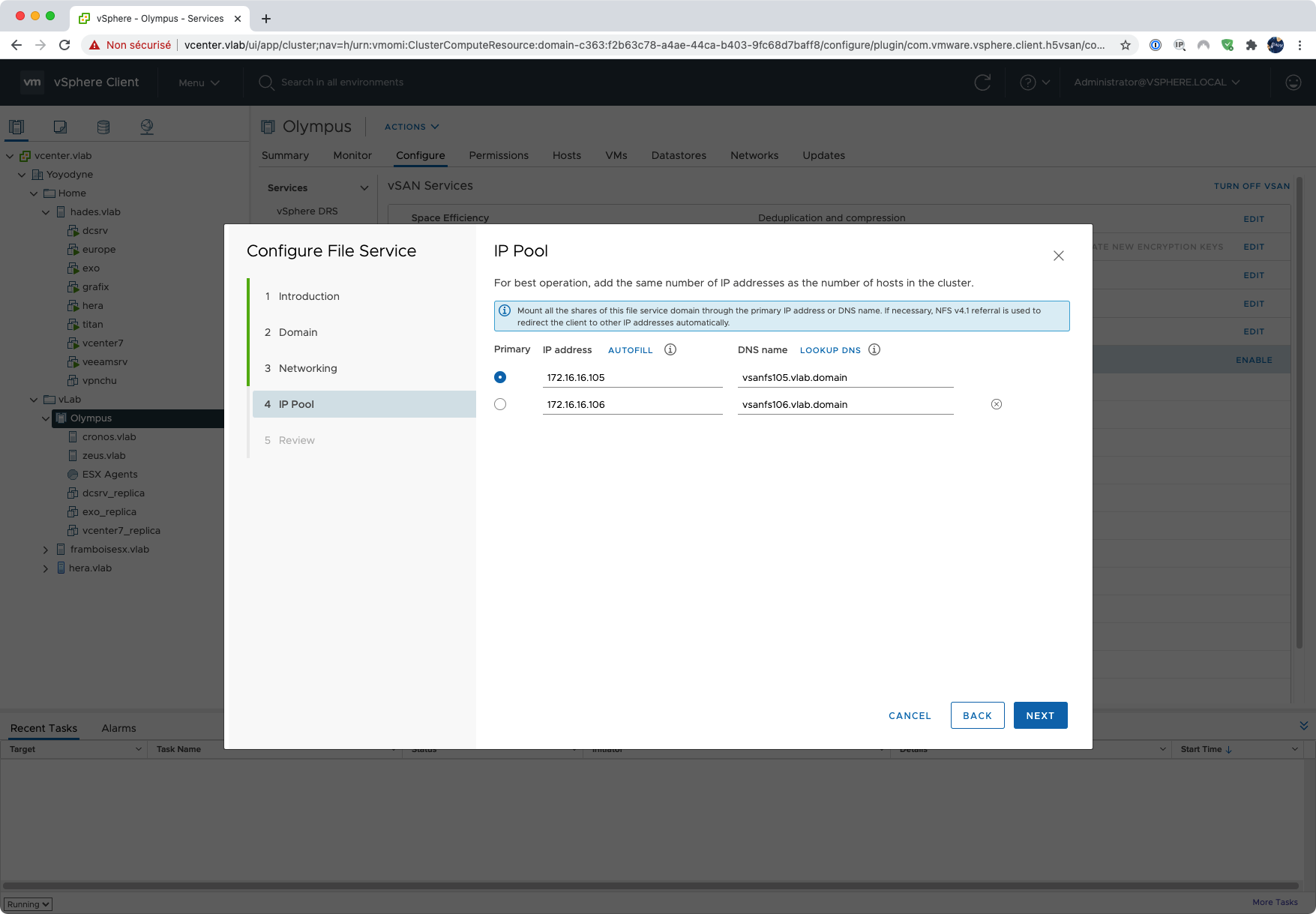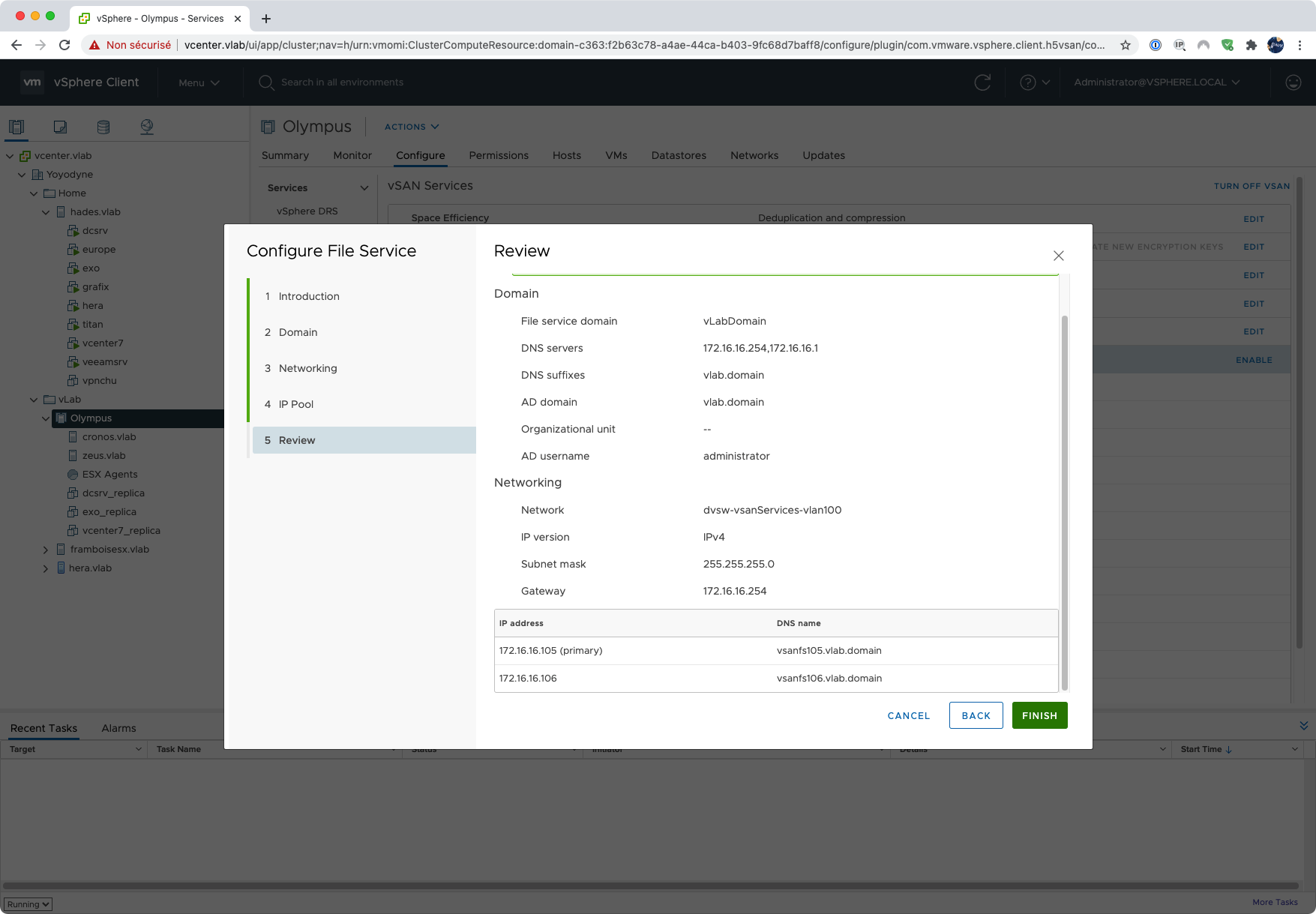 Ensuite, on donne l’identité réseau de chaque VM qui va être créé sur chaque host, au sein du cluster. Attention à bien tout déclarer sur vos DNS au préalable, comme toujours avec vSAN et vSphere. Après, une phase d’auto-configuration qui prend quelques minutes, suivant la taille de votre environnement, les File Services sont opérationnels et prêts à être utilisés.